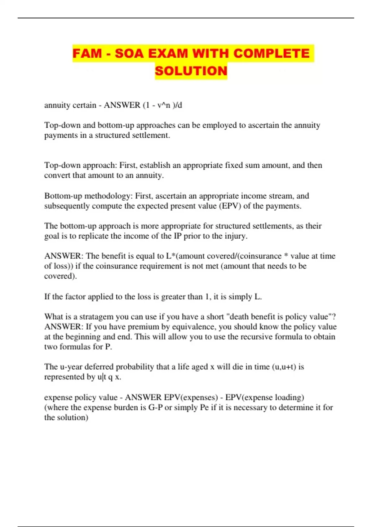 FAM - SOA EXAM WITH COMPLETE SOLUTION