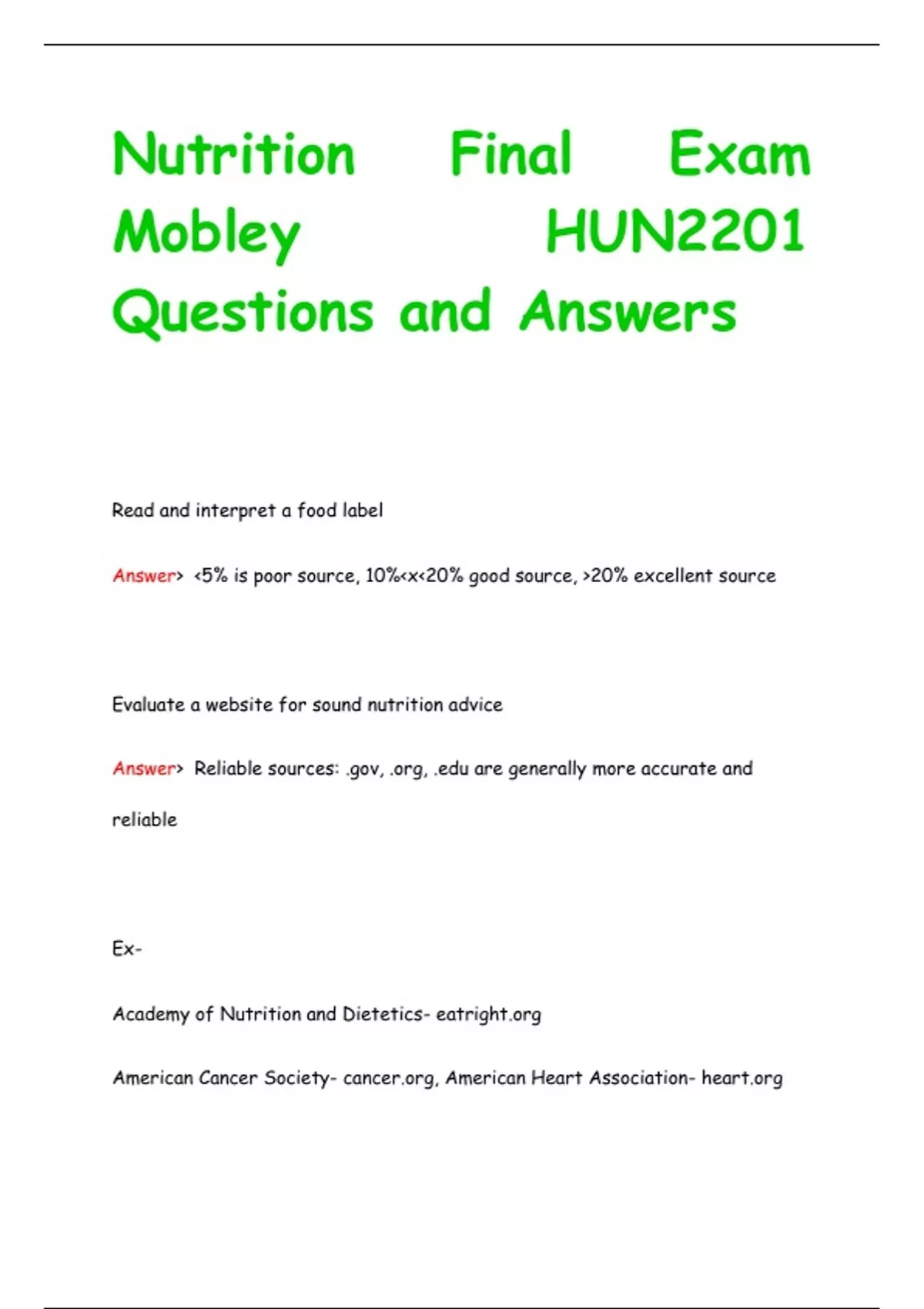 Nutrition Final Exam Mobley HUN2201 Questions and Answers