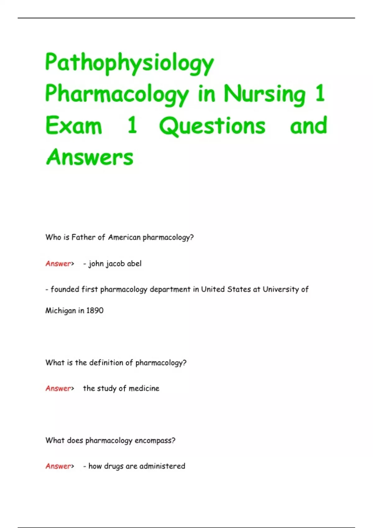 Pathophysiology Pharmacology in Nursing 1 Exam 1 Questions and Answer