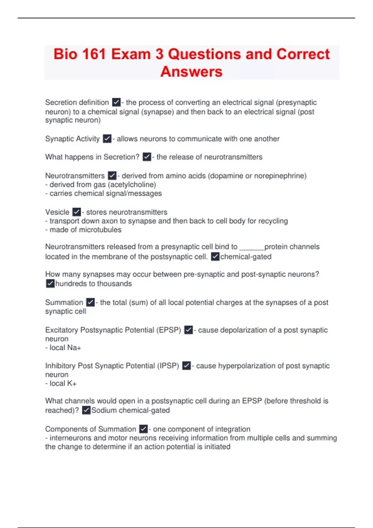 Secretion definition - the process of converting an electrical signal (presynaptic neuron) to a chemical signal (synapse) and then back to an electrical signal (post synaptic neuron) Synaptic Activity - allows neurons to communicate with one another What happens in Secretion? - the release of neurotransmitters Neurotransmitters - derived from amino acids (dopamine or norepinephrine) - derived from gas (acetylcholine) - carries chemical signal/messages Vesicle - stores neurotransmitters - transport down axon to synapse and then back to cell body for recycling - made of microtubules Neurotransmitters released from a presynaptic cell bind to ______protein channels located in the membrane of the postsynaptic cell. chemical-gated How many synapses may occur between pre-synaptic and post-synaptic neurons? hundreds to thousands Summation - the total (sum) of all local potential charges at the synapses of a post synaptic cell Excitatory Postsynaptic Potential (EPSP) - cause depolarization of a post synaptic neuron - local Na+ Inhibitory Post Synaptic Potential (IPSP) - cause hyperpolarization of post synaptic neuron - local K+ What channels would open in a postsynaptic cell during an EPSP (before threshold is reached)? Sodium chemical-gated Components of Summation - one component of integration - interneurons and motor neurons receiving information from multiple cells and summing the change to determine if an action potential is initiated