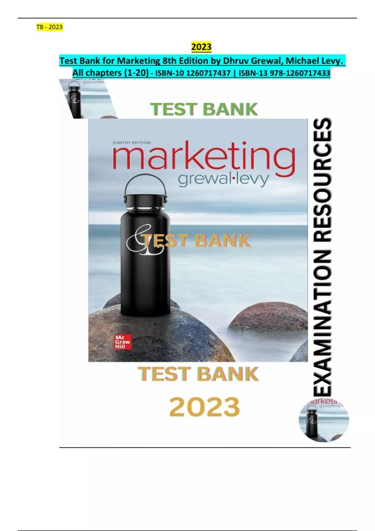 Exam Resources - TB for Marketing 8th Edition by Dhruv Grewal, Michael Levy - All chapters (1-20) Included.
