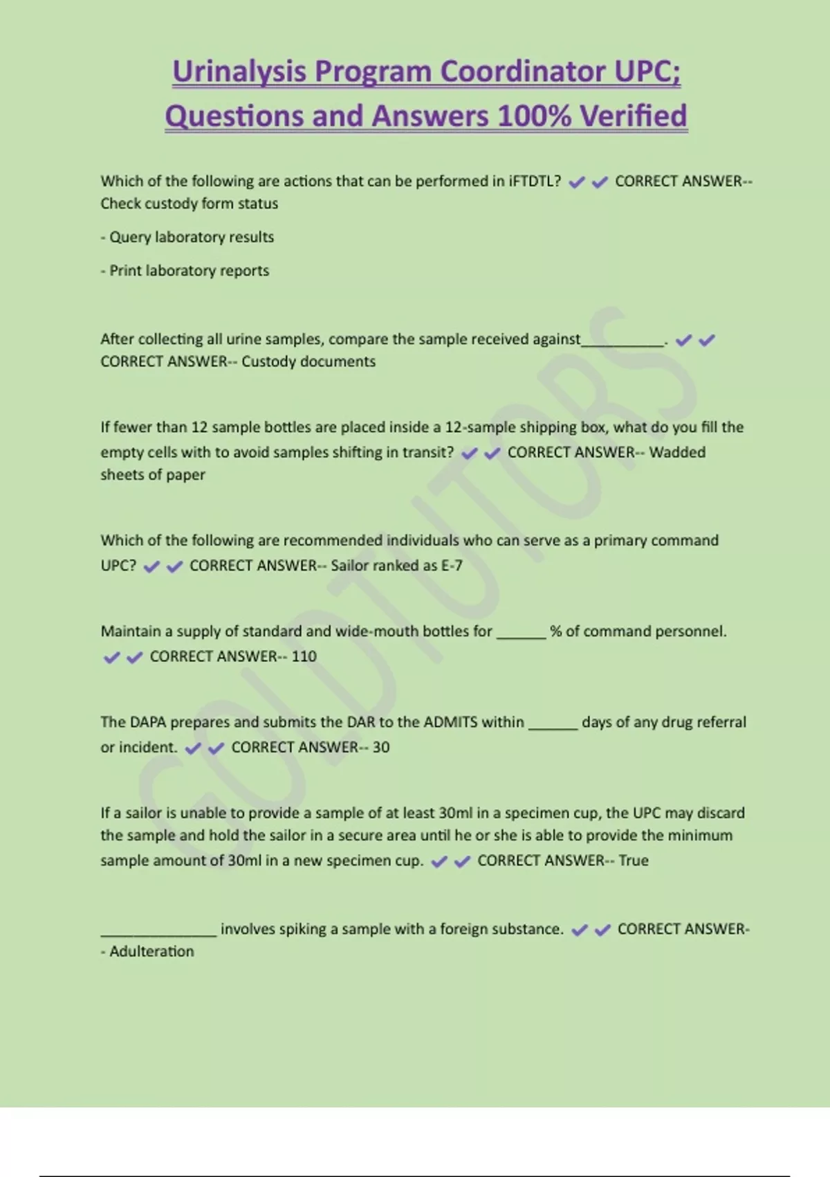 Urinalysis Program Coordinator UPC; Questions and Answers 100% Verified Which of the following are actions that can be performed in iFTDTL? CORRECT ANSWER-- Check custody form status - Query laboratory results - Print laboratory reports After collecting all urine samples, compare the sample received against__________. CORRECT ANSWER-- Custody documents If fewer than 12 sample bottles are placed inside a 12-sample shipping box, what do you fill the empty cells with to avoid samples shifting in transit? CORRECT ANSWER-- Wadded sheets of paper