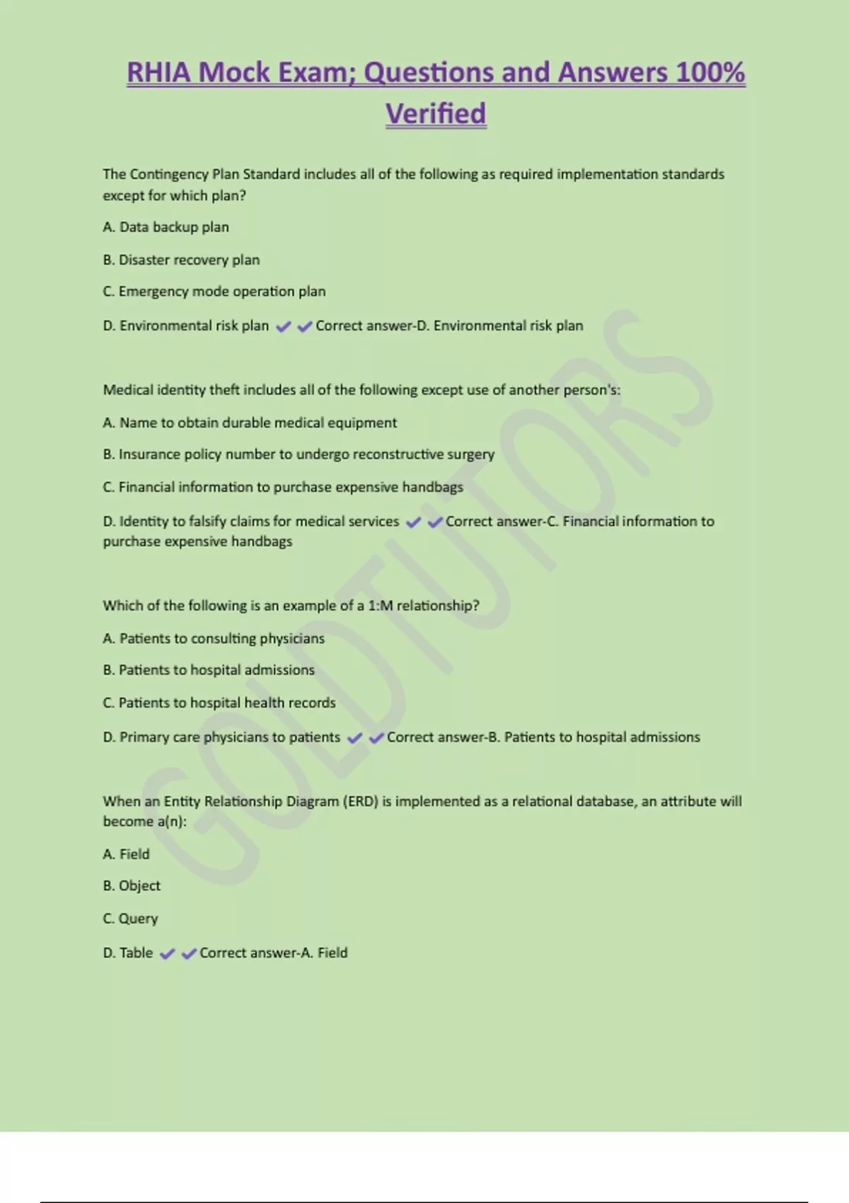 RHIA Mock Exam; Questions and Answers 100% Verified The Contingency Plan Standard includes all of the following as required implementation standards except for which plan? A. Data backup plan B. Disaster recovery plan C. Emergency mode operation plan D. Environmental risk plan Correct answer-D. Environmental risk plan Medical identity theft includes all of the following except use of another person's: A. Name to obtain durable medical equipment B. Insurance policy number to undergo reconstructive surgery C. Financial information to purchase expensive handbags D. Identity to falsify claims for m