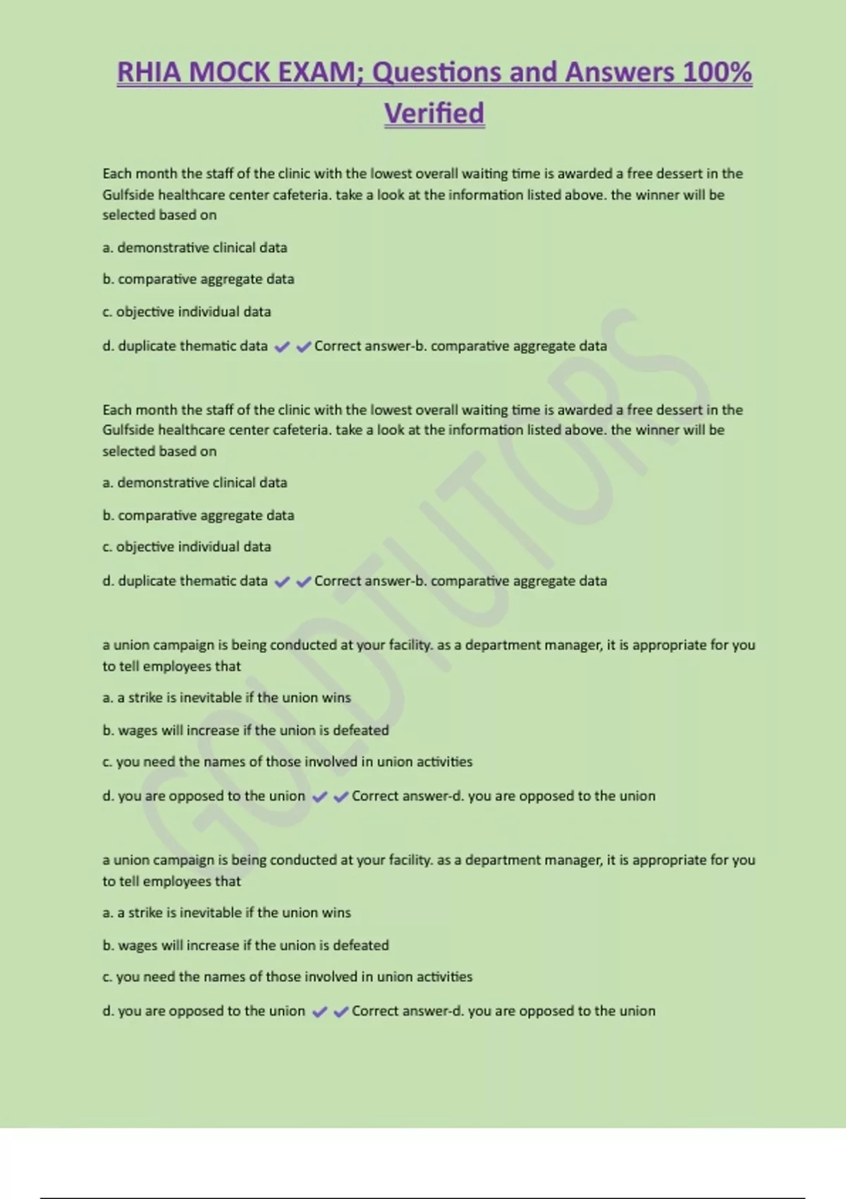RHIA MOCK EXAM; Questions and Answers 100% Verified Each month the staff of the clinic with the lowest overall waiting time is awarded a free dessert in the Gulfside healthcare center cafeteria. take a look at the information listed above. the winner will be selected based on a. demonstrative clinical data b. comparative aggregate data c. objective individual data d. duplicate thematic data Correct answer-b. comparative aggregate data Each month the staff of the clinic with the lowest overall waiting time is awarded a free dessert in the Gulfside healthcare center cafeteria. take a look at the information listed above. the winner will be selected based on a. demonstrative clinical data b. comparative aggregate data c. objective individual data d. duplicate thematic data Correct answer-b. comparative aggregate data