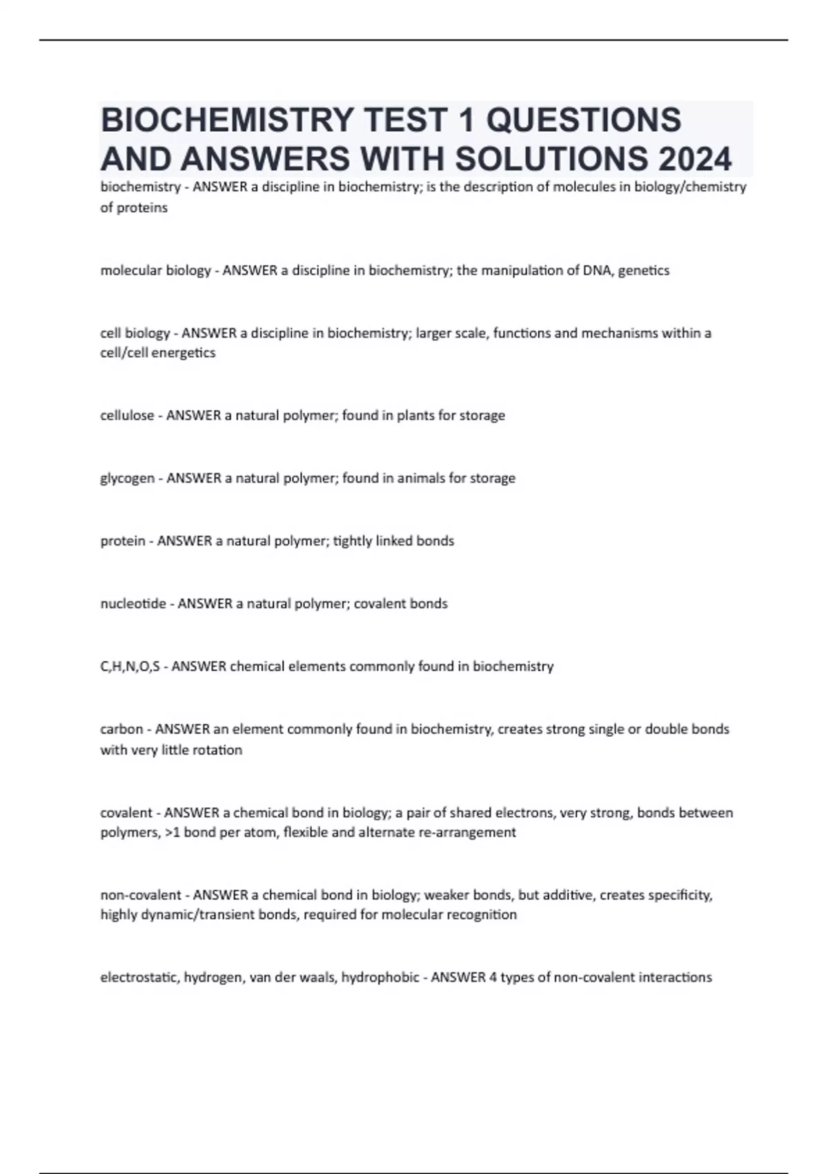 BIOCHEMISTRY TEST 1 QUESTIONS AND ANSWERS WITH SOLUTIONS 2024