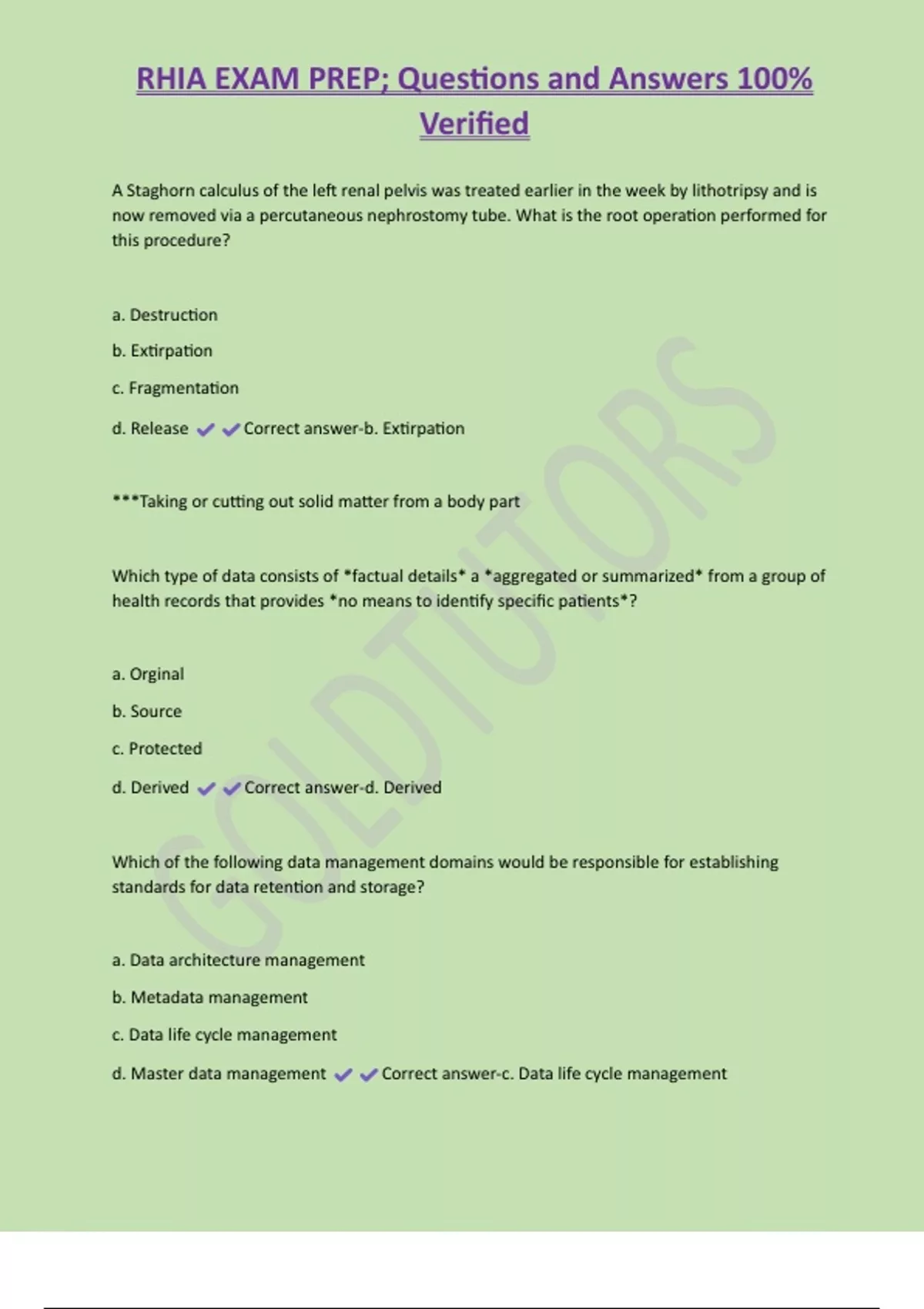 RHIA EXAM PREP; Questions and Answers 100% Verified A Staghorn calculus of the left renal pelvis was treated earlier in the week by lithotripsy and is now removed via a percutaneous nephrostomy tube. What is the root operation performed for this procedure? a. Destruction b. Extirpation c. Fragmentation d. Release Correct answer-b. Extirpation ***Taking or cutting out solid matter from a body part Which type of data consists of *factual details* a *aggregated or summarized* from a group of health records that provides *no means to identify specific patients*? a. Orginal b. Source c. Protected d. Derived Correct answer-d. Derived