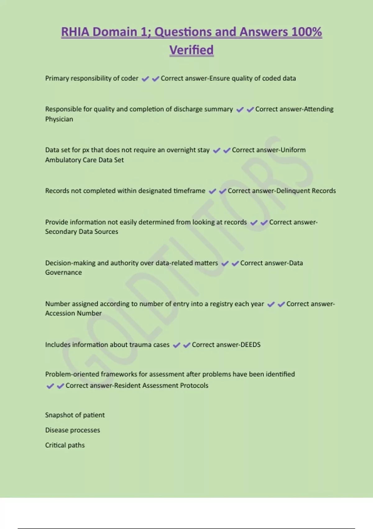 RHIA Domain 1; Questions and Answers 100% Verified Primary responsibility of coder Correct answer-Ensure quality of coded data Responsible for quality and completion of discharge summary Correct answer-Attending Physician Data set for px that does not require an overnight stay Correct answer-Uniform Ambulatory Care Data Set Records not completed within designated timeframe Correct answer-Delinquent Records Provide information not easily determined from looking at records Correct answerSecondary Data Sources