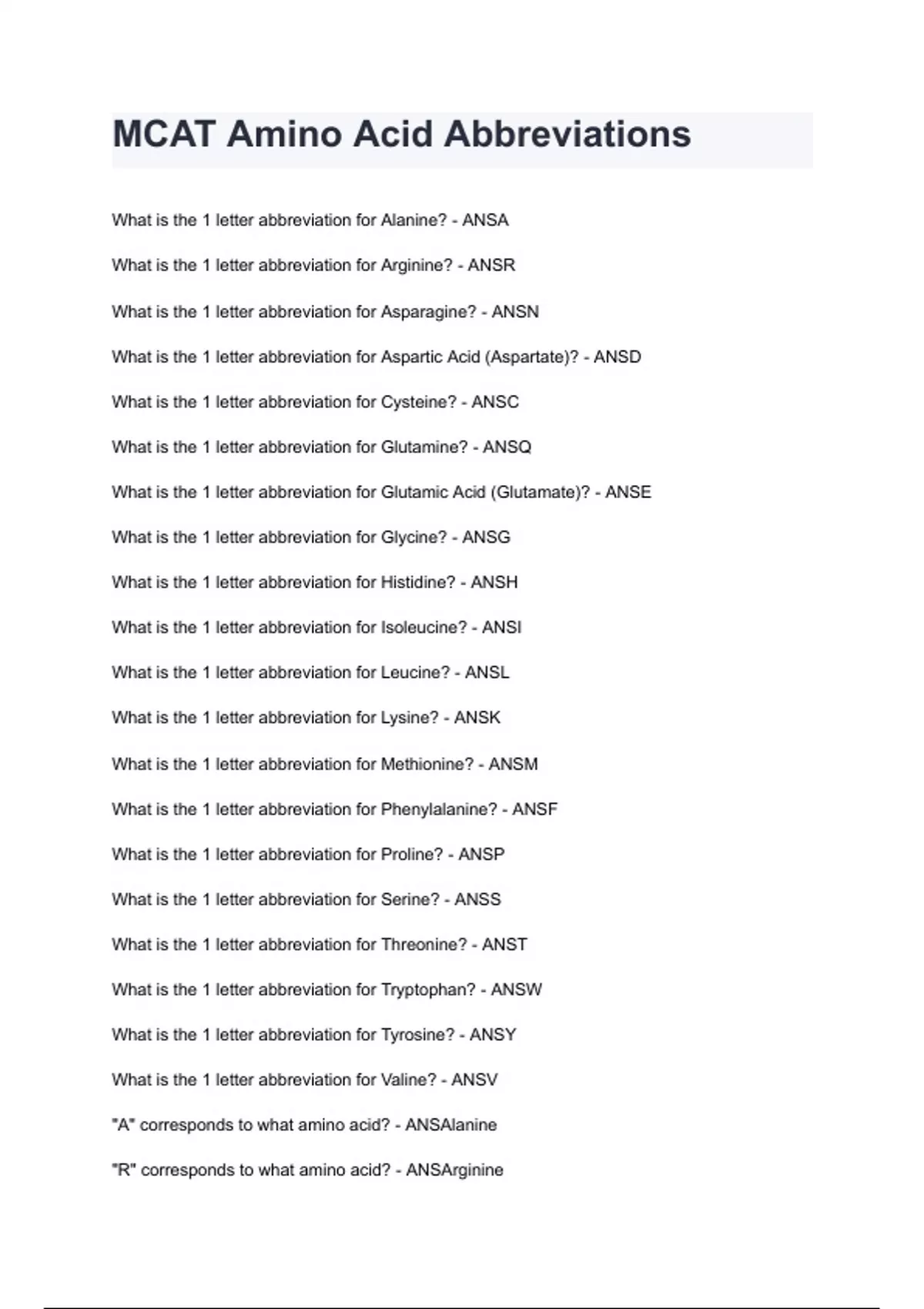MCAT Amino Acid Abbreviations
