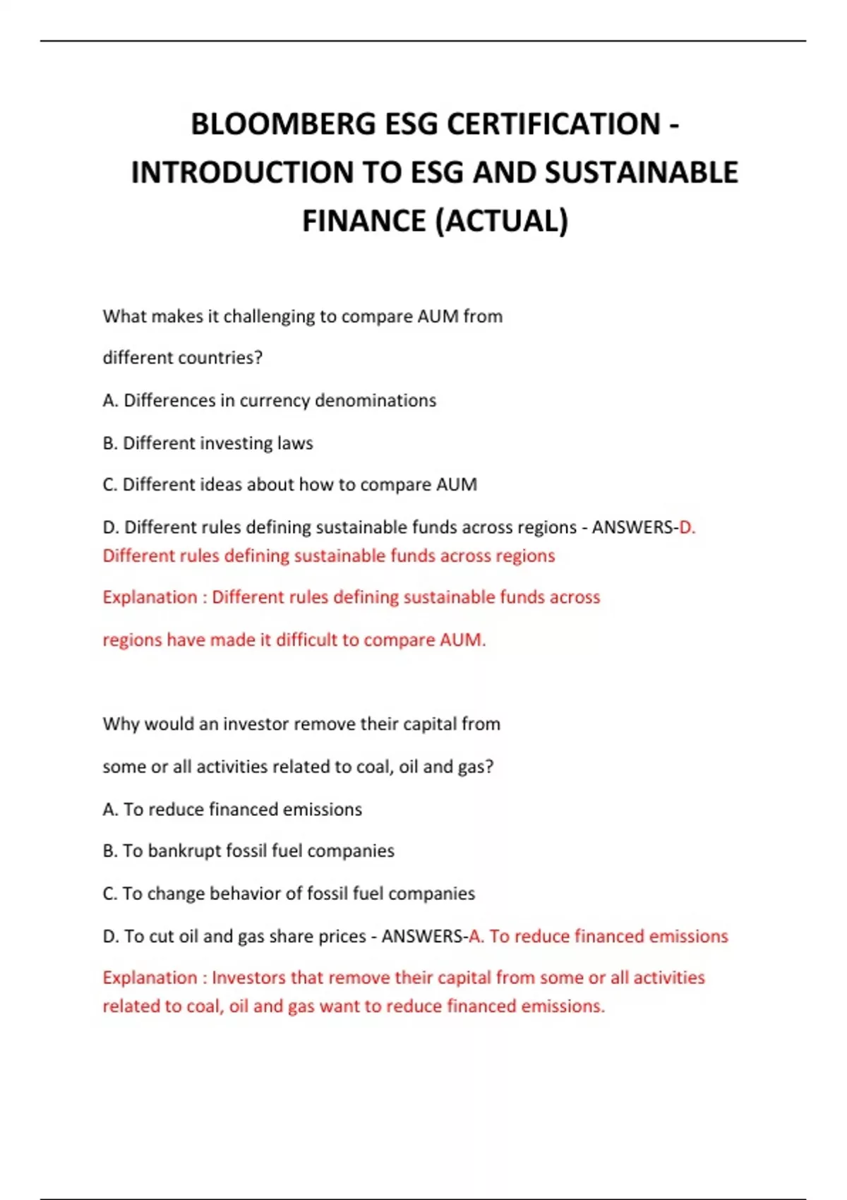 BLOOMBERG ESG CERTIFICATION - INTRODUCTION TO ESG AND SUSTAINABLE FINANCE (ACTUAL) 2024 Q/A