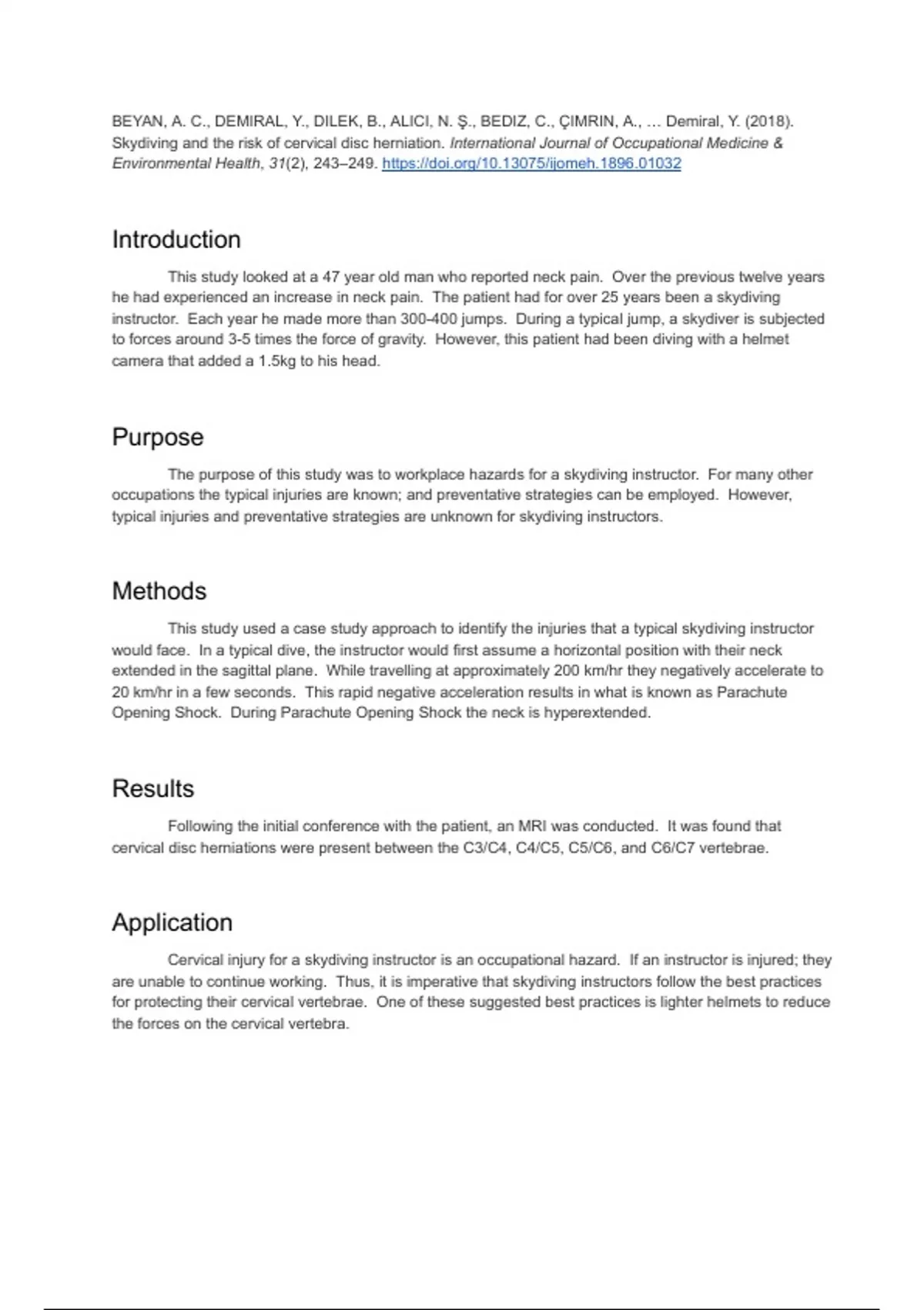 This study looked at a 47 year old man who reported neck pain. Over the previous twelve years he had experienced an increase in neck pain. The patient had for over 25 years been a skydiving instructor. Each year he made more than 300-400 jumps. During a typical jump, a skydiver is subjected to forces around 3-5 times the force of gravity. However, this patient had been diving with a helmet camera that added a 1.5kg to his head.