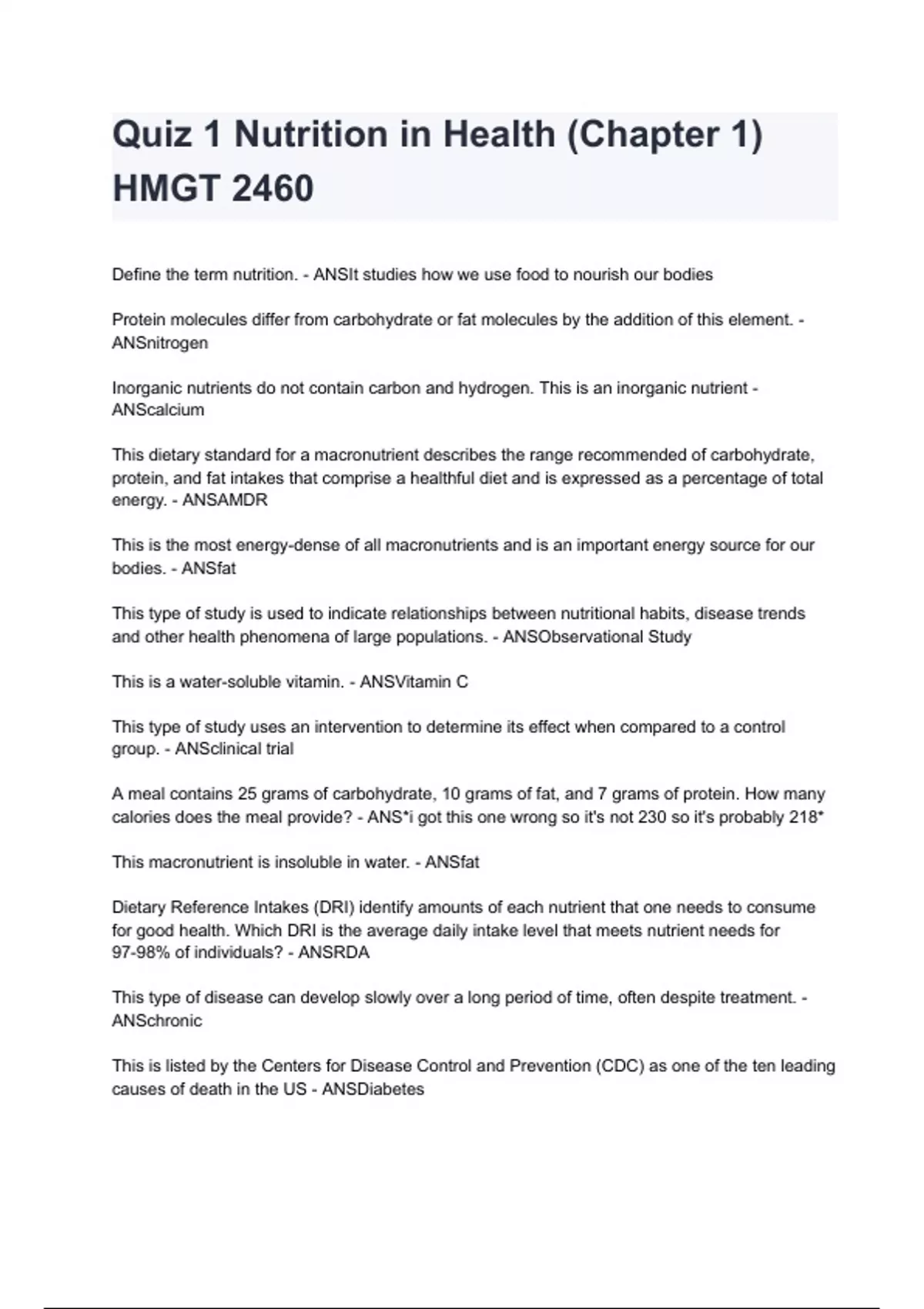 Quiz 1 Nutrition in Health (Chapter 1) HMGT 2460 Test bank