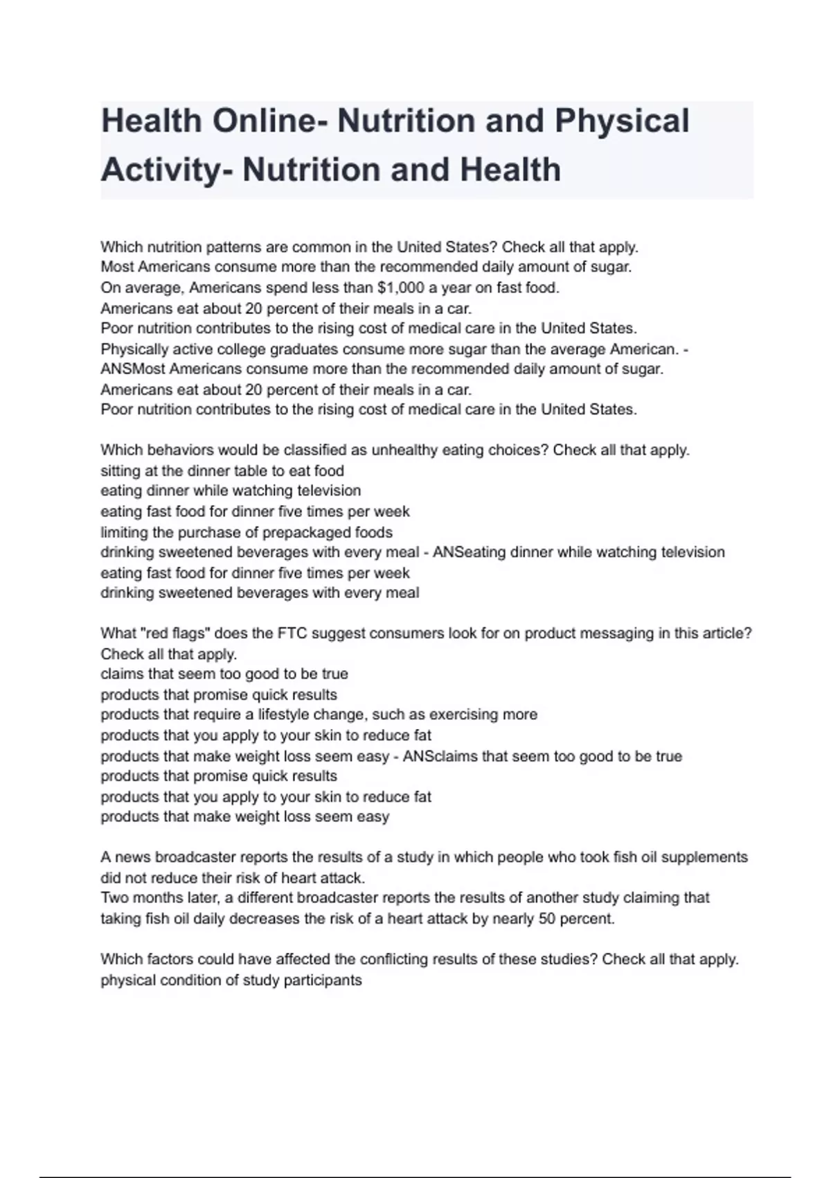 Health Online- Nutrition and Physical Activity- Nutrition and Health Test bank