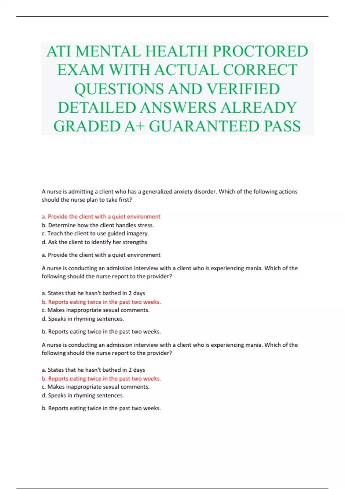 ATI MENTAL HEALTH PROCTORED EXAM WITH ACTUAL CORRECT QUESTIONS AND VERIFIED DETAILED ANSWERS ALREADY GRADED A+ GUARANTEED PASS