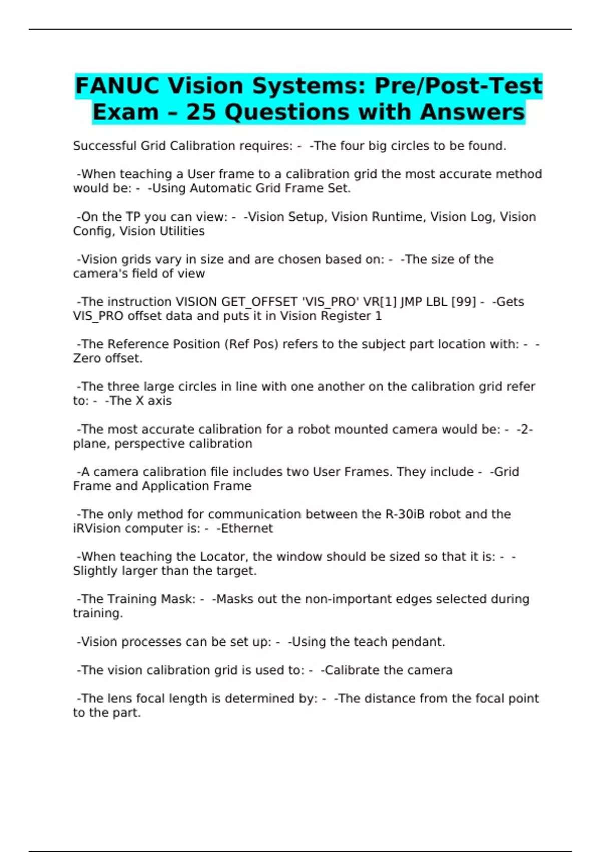 FANUC Vision Systems: Pre/Post-Test Exam – 25 Questions with Answers