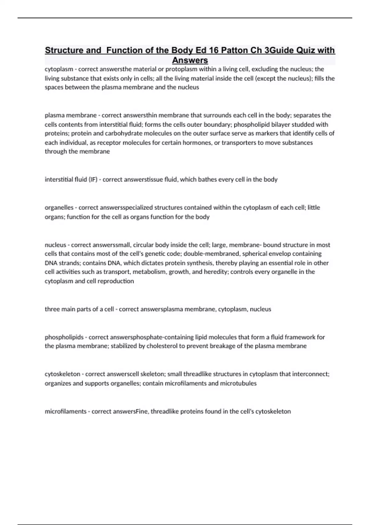 Structure and Function of the Body Ed 16 Patton Ch 3Guide Quiz with Answers cytoplasm - correct answersthe material or protoplasm within a living cell, excluding the nucleus; the living substance that exists only in cells; all the living material inside the cell (except the nucleus); fills the spaces between the plasma membrane and the nucleus plasma membrane - correct answersthin membrane that surrounds each cell in the body; separates the cells contents from interstitial fluid; forms the cells outer boundary; phospholipid bilayer studded with proteins; protein and carbohydrate molecules on the outer surface serve as markers that identify cells of each individual, as receptor molecules for certain hormones, or transporters to move substances through the membrane interstitial fluid (IF) - correct answerstissue fluid, which bathes every cell in the body organelles - correct answersspecialized structures contained within the cytoplasm of each cell; little organs; function for the cell as organs function for the body nucleus - correct answerssmall, circular body inside the cell; large, membrane- bound structure in most cells that contains most of the cell's genetic code; double-membraned, spherical envelop containing DNA strands; contains DNA, which dictates protein synthesis, thereby playing an essential role in other cell activities such as transport, metabolism, growth, and heredity; controls every organelle in the cytoplasm and cell reproduction three main parts of a cell - correct answersplasma membrane, cytoplasm, nucleus phospholipids - correct answersphosphate-containing lipid molecules that form a fluid framework for the plasma membrane; stabilized by cholesterol to prevent breakage of the plasma membrane cytoskeleton - correct answerscell skeleton; small threadlike structures in cytoplasm that interconnect; organizes and supports organelles; contain microfilaments and microtubules microfilaments - correct answersFine, threadlike proteins found in the cell's cytoskeleton