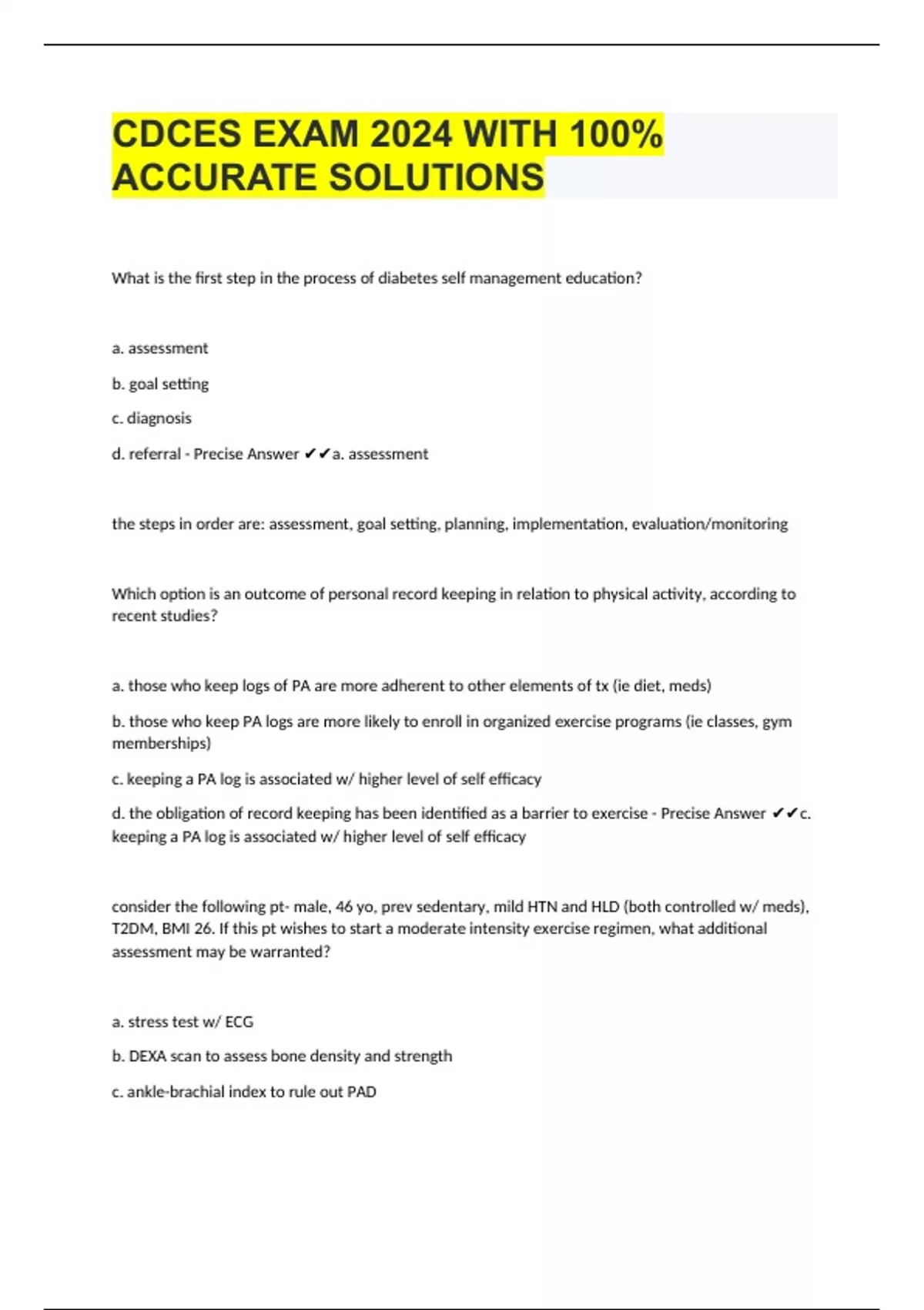 CDCES EXAM 2024 WITH 100% ACCURATE SOLUTIONS Ace Your Exams with YANCHYSTUVIA! Are exams, assignments, and projects stressing you out? Say goodbye to academic anxiety with Yanchy – your ultimate online study buddy! Why Choose Yanchy? Expert Test Prep: Get access to comprehensive study guides, practice exams, and tips from top educators to boost your test scores. Assignment Assistance: Struggling with assignments? Our experts are here to help you understand and complete your homework on time. Project Support: From brainstorming to final presentation, our team provides step-by-step guidance to make your projects shine. 24/7 Availability: Study at your own pace with resources available round the clock. Affordable Pricing: Quality education support without breaking the bank. Special Offer! Sign up today and get 20% OFF your first service! Use code: YANCHY20 at checkout. Join Thousands of Successful Students! Don’t let academic challenges hold you back. Empower your education journey with Yanchy and achieve the grades you deserve. Visit us now at and start succeeding today! Feel free to modify any details to better suit your needs!
