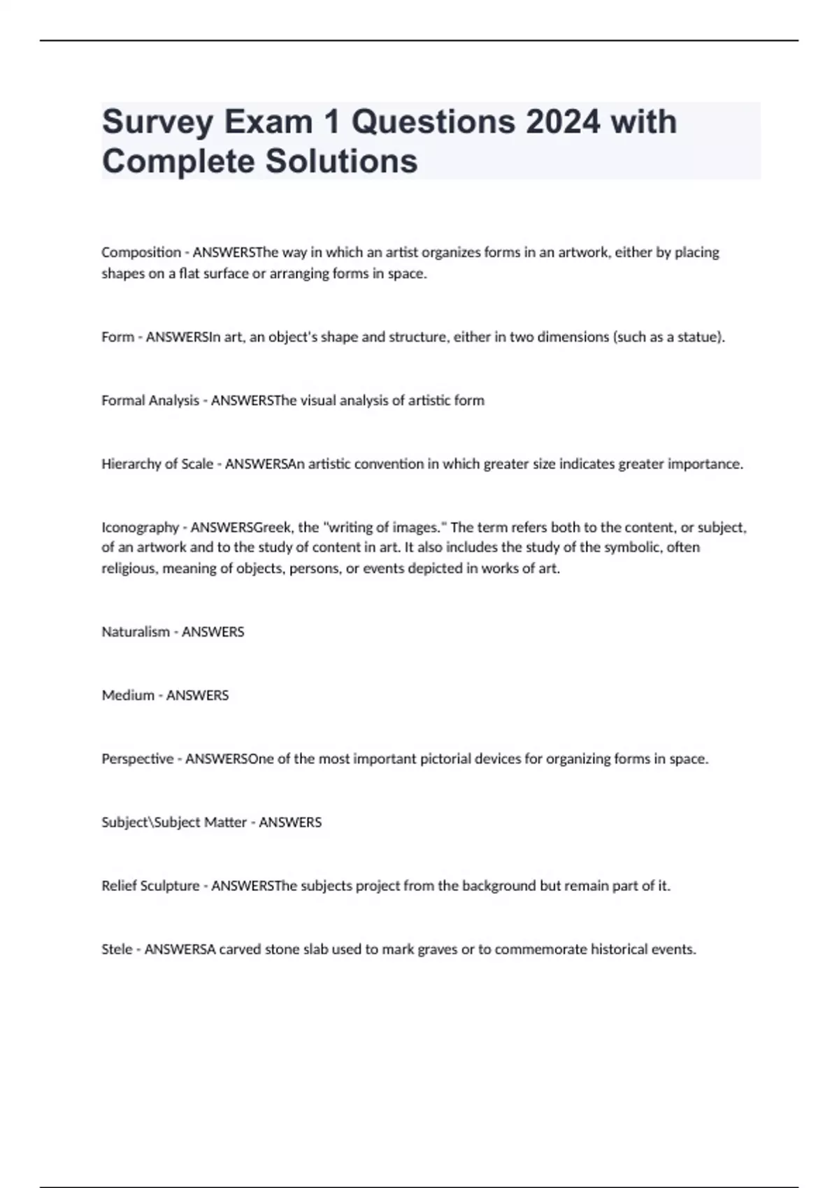 Survey Exam 1 Questions 2024 with Complete Solutions Composition - ANSWERSThe way in which an artist organizes forms in an artwork, either by placing shapes on a flat surface or arranging forms in space. Form - ANSWERSIn art, an object's shape and structure, either in two dimensions (such as a statue). Formal Analysis - ANSWERSThe visual analysis of artistic form Hierarchy of Scale - ANSWERSAn artistic convention in which greater size indicates greater importance. Iconography - ANSWERSGreek, the "writing of images." The term refers both to the content, or subject, of an artwork and to the study of content in art. It also includes the study of the symbolic, often religious, meaning of objects, persons, or events depicted in works of art. Naturalism - ANSWERS Medium - ANSWERS Perspective - ANSWERSOne of the most important pictorial devices for organizing forms in space. SubjectSubject Matter - ANSWERS Relief Sculpture - ANSWERSThe subjects project from the background but remain part of it. Stele - ANSWERSA carved stone slab used to mark graves or to commemorate historical events.