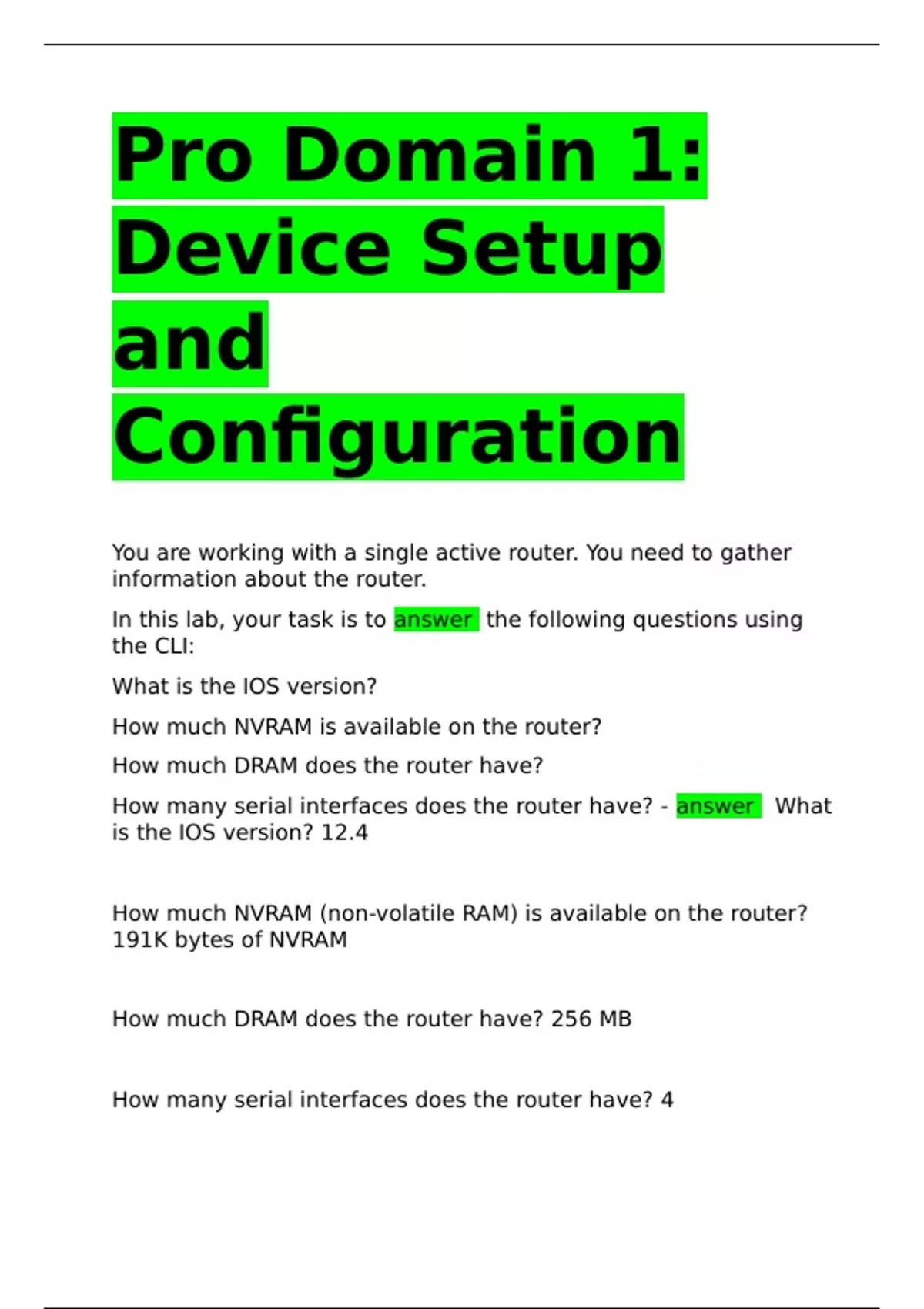 You are working with a single active router. You need to gather information about the router. In this lab, your task is to answer the following questions using the CLI: What is the IOS version? How much NVRAM is available on the router? How much DRAM does the router have? How many serial interfaces does the router have? What is the IOS version? 12.4 How much NVRAM (non-volatile RAM) is available on the router? 191K bytes of NVRAM How much DRAM does the router have? 256 MB How many serial interfaces does the router have? 4 You have just connected two routers through their serial ports in a back-to-back configuration. You've already configured IP addresses on the Fa0/0 and Fa0/1 interfaces for both routers and have configured a static route on each router for the networks accessible through the other router. You need to complete the configuration by configuring the serial link between the two routers. Remember that a 30-bit mask has a magic number of 4. Valid subnets are 192.168.2.0, 192.168.2.4, 192.168.2.8, etc. The seventh subnet is 192.168.2.24. The first valid address on that subnet is 192.168.2.25. The last valid address on that subnet is 192.168.2.26. A 30-bit mask uses a mask value of 255.255.255.252. In this lab, your task is to: Assign an IP address to each serial interface. Use the seventh subnet on network 192.168.2.0 using a 30-bit mask:For S0/0/0 on RouterA, assign the first address on the subnet.For S0/0/1 on RouterB, ass Find the DCE interface. Select RouterA. Press Enter to get started. At the RouterA> prompt, type show controllers s0/0/0 and press Enter. Select RouterB. Press Enter to get started. At the RouterB> prompt, type show controllers s0/0/1 and press Enter. RouterB has the DCE interface. Configure RouterB. At the RouterB> prompt, type enable and press Enter. At the RouterB# prompt, type config t and press Enter. At the RouterB(config)# prompt, type interface s0/0/1 and press Enter. At the RouterB(config-if)# prompt, type ip address 192.168.2.26 255.255.255.252 and press Enter. At the RouterB(config-if)# prompt, type clock rate 9600 and press Enter. At the RouterB(config-if)# prompt, type no shutdown and press Enter. Press Ctrl + Z. At the RouterB# prompt, type copy run start and press Enter. Press Enter to begin building the configuration. Configure RouterA. At the RouterA> prompt, type enable and press Enter. At the RouterA# prompt, type config t and press Enter. At the RouterA(config)# prompt, type interface s0/0/0 and press Enter. At the RouterA(config-if)# prompt, type ip address 192.168.2.25 255.255.255.252 and press Enter. At the RouterA(config-if)# prompt, type no shutdown and press Enter. Press Ctrl + Z. At the RouterA# prompt, type copy run start and press Enter. Press Enter to begin building the configuration. You manage the small branch office shown in the network diagram. You have connected all devices. Now you need to configure the hostname and interface descriptions on each Cisco device at the branch location. In this lab, your task is to: Change the hostname on the switch to Branch1. Change the router name to SFO. Configure the following interface descriptions: DeviceInterfaceDescriptiontext Branch1FastEthernet0/1Wrk1FastEthernet0/2Wrk2FastEthernet0/3Wrk3FastEthernet0/24Default gatewaySFOFastEthernet0/0Link to branch officeSerial0/1/0Link to main officeSerial0/1/1Link to internet Configure the hostname and the interface descriptions on the switch. Select Branch 1 in the diagram. Press Enter to get started. At the > prompt, type enable and press Enter. At the # prompt, type configure terminal and press Enter. At the (config)# prompt, type hostname Branch1 and press Enter. At the Branch1(config)# prompt, type interface FastEthernet0/1 and press Enter. At the Branch1(config-if)# prompt, type description Wrk1 and press Enter. At the Branch1(config-if)# prompt, type interface FastEthernet0/2 and press Enter. At the Branch1(config-if)# prompt, type description Wrk2 and press Enter. At the Branch1(config-if)# prompt, type interface FastEthernet0/3 and press Enter. At the Branch1(config-if)# prompt, type description Wrk3 and press Enter. At the Branch1(config-if)# prompt, type interface FastEthernet0/24 and press Enter. At the Branch1(config-if)# prompt, type description Default gateway and press Enter. At the Branch1(config-if)# prompt, type exit and press Enter. At the Branch1(config)# prompt, type exit and press Enter. At the Branch1# prompt, type copy running-config startup-config and press Enter. Press Enter. Configure the hostname and the interface descriptions on the router. Select SFO in the diagram.
