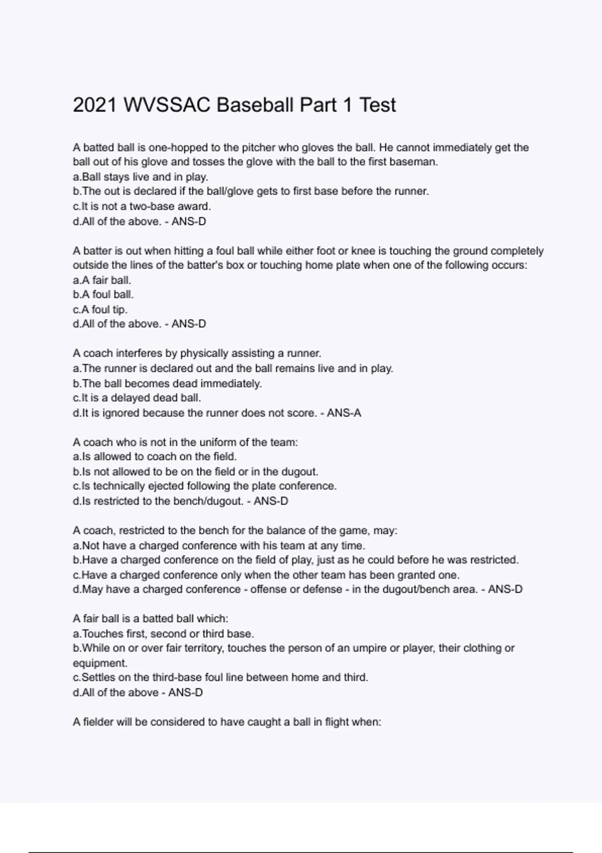 2021 WVSSAC Baseball Part 1 Test (2024/ 2025) Questions and Verified Answers| 100% Correct