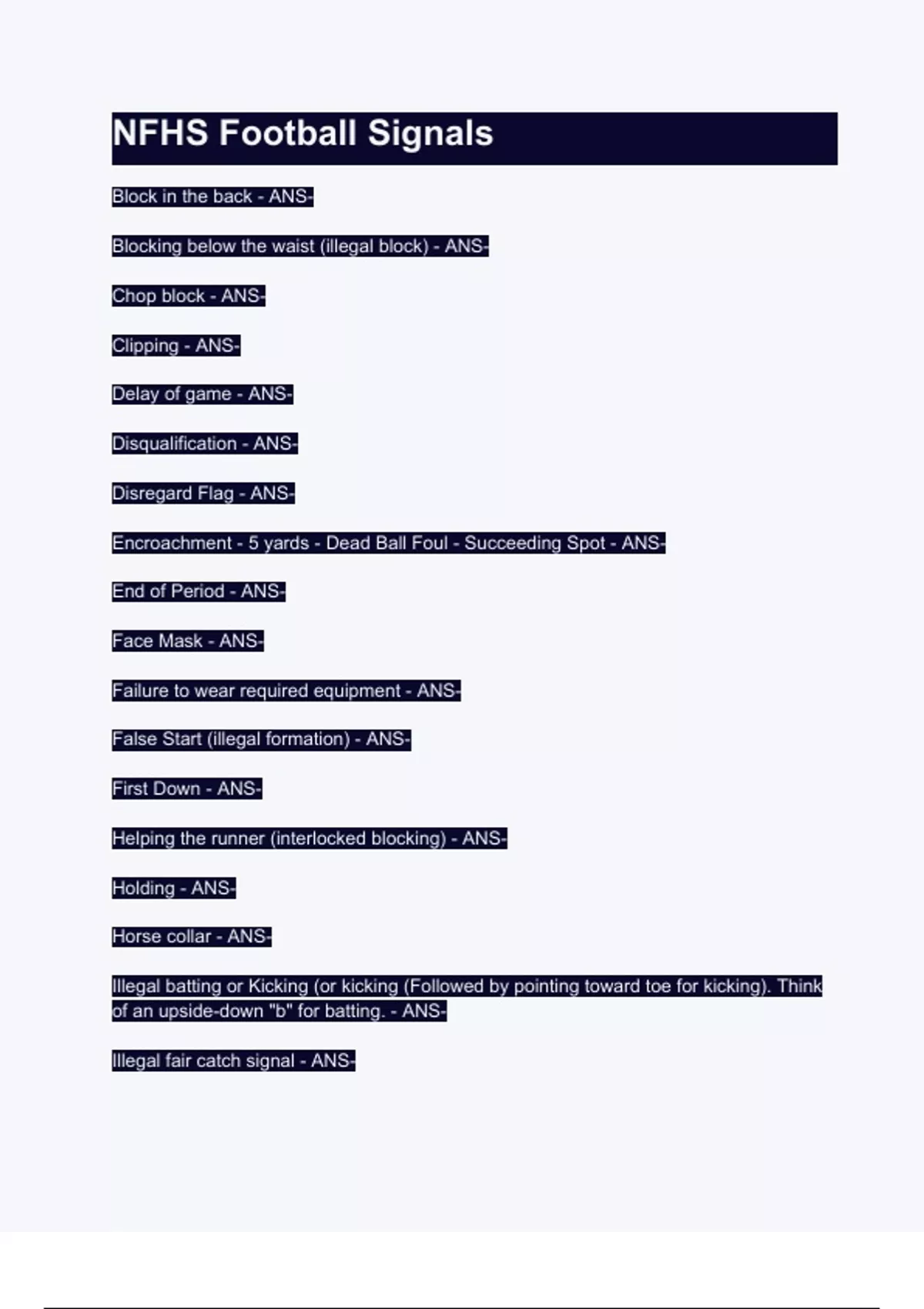 NFHS Football Signals (2024/ 2025) Questions and Verified Answers| 100% Correct