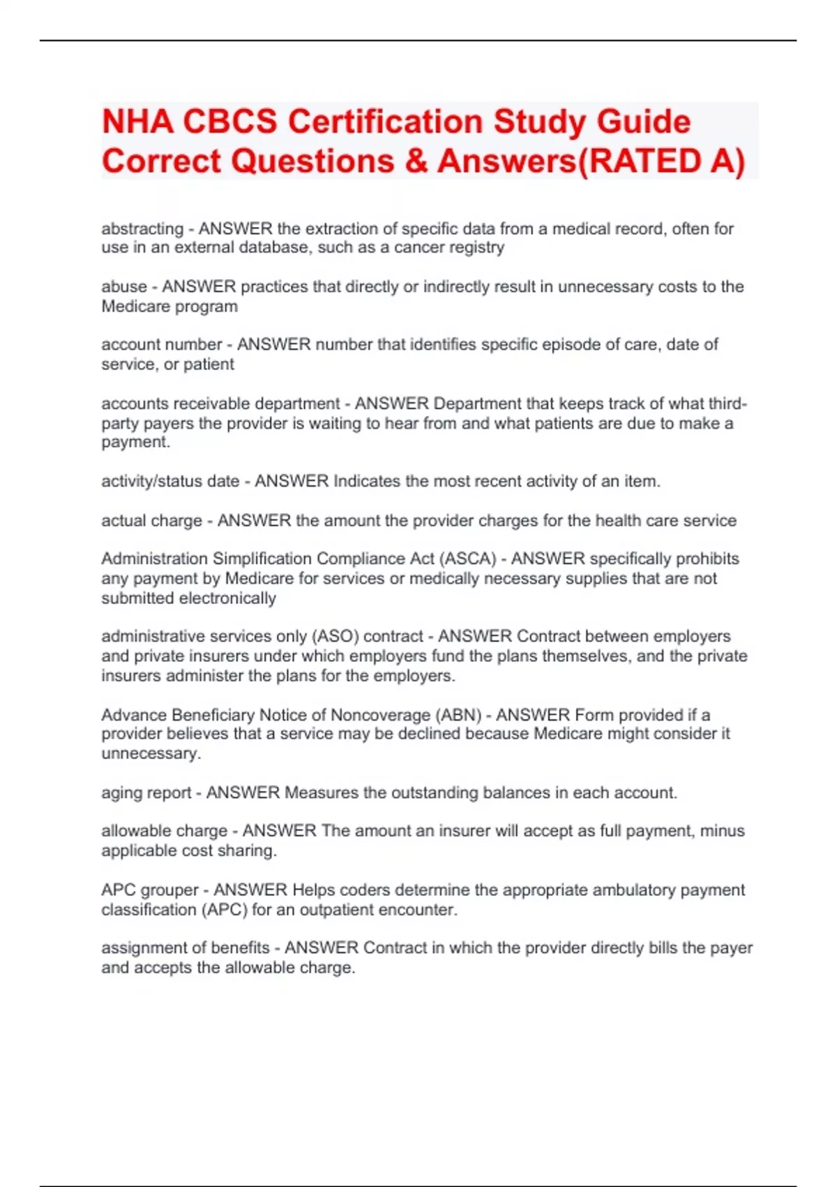 NHA CBCS Certification Study Guide Correct Questions & Answers(RATED A)