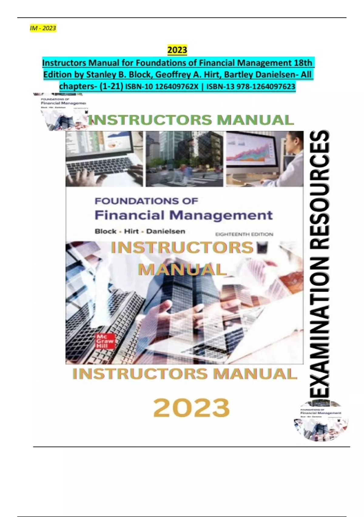 Exam Resources - Instructors Manual for Foundations of Financial Management 18th Edition by Stanley B. Block, Geoffrey A. Hirt, Bartley Danielsen- All chapters (1-21) Included