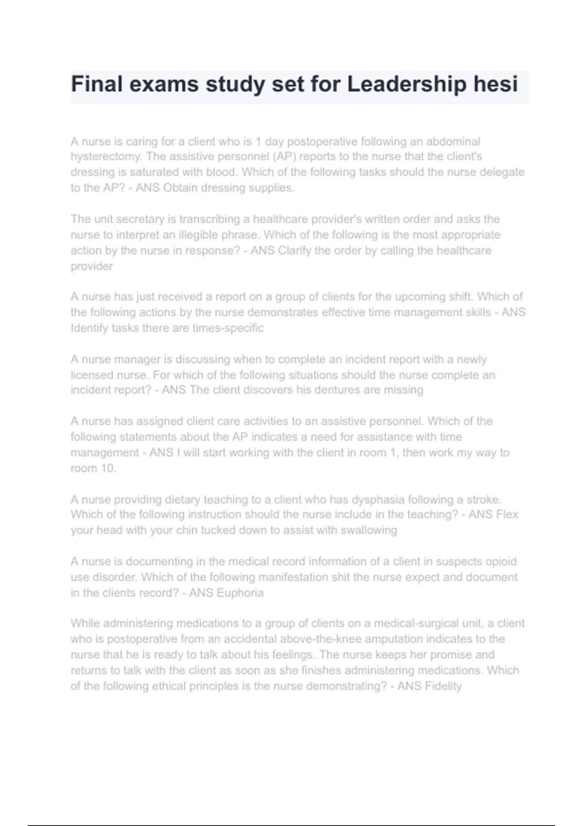 Final exams study set for Leadership hesi Questions With Completed & Verified Solutions Latest Update 2024.