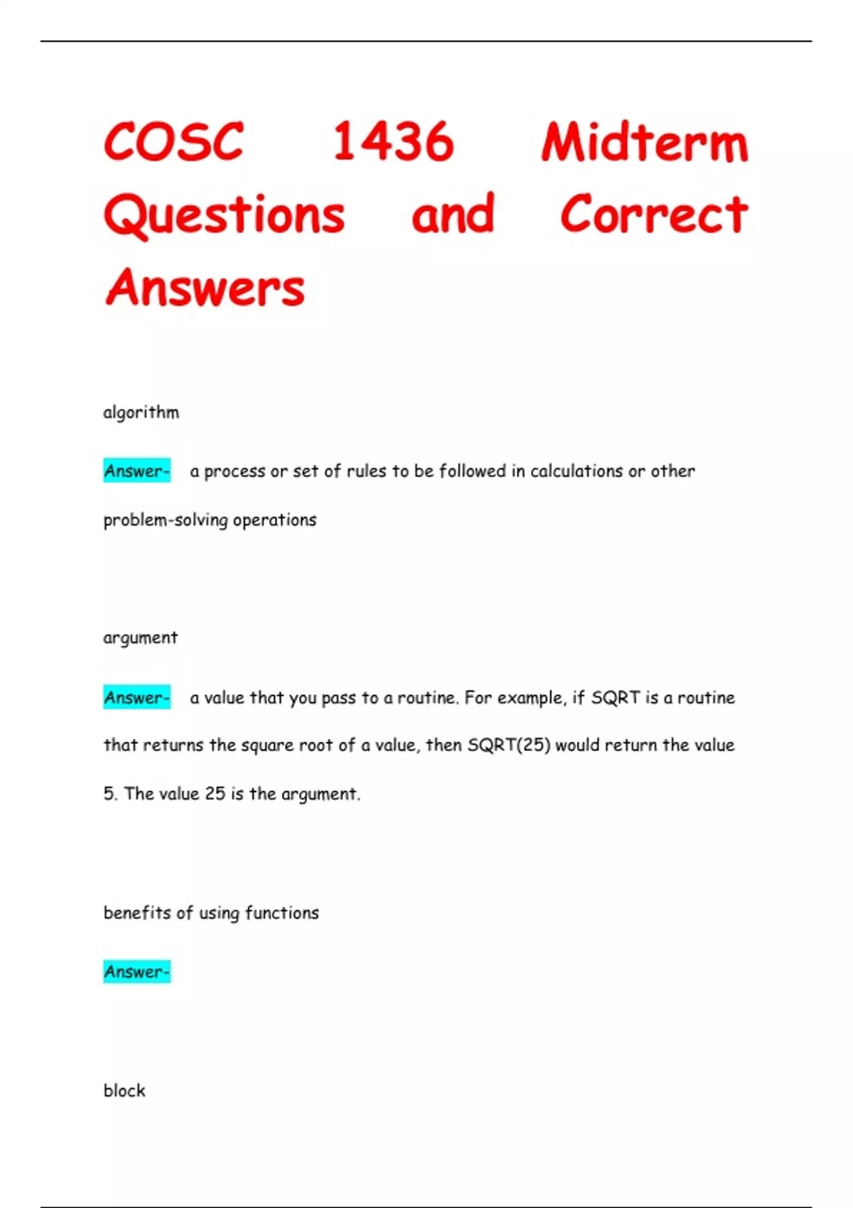 algorithm Answer- a process or set of rules to be followed in calculations or other problem-solving operations argument Answer- a value that you pass to a routine. For example, if SQRT is a routine that returns the square root of a value, then SQRT(25) would return the value 5. The value 25 is the argument. benefits of using functions Answerblock Answer- a structure of source code where some is grouped together (think: what would be going between the brackets) break Answer- break is used within loops and switch statements to jump to the end of the code block. It causes the "//code..." above to be skipped and terminates the loop. In switch case statements, break causes the remaining cases to be skipped--it prevents "falling through" to other cases. byte Answer- unit of digital information that most commonly consists of eight bits character Answer- a character is a unit of information that roughly corresponds to a grapheme, grapheme-like unit, or symbol cin Answer- input code; prompting user to assign a value to a given variabl