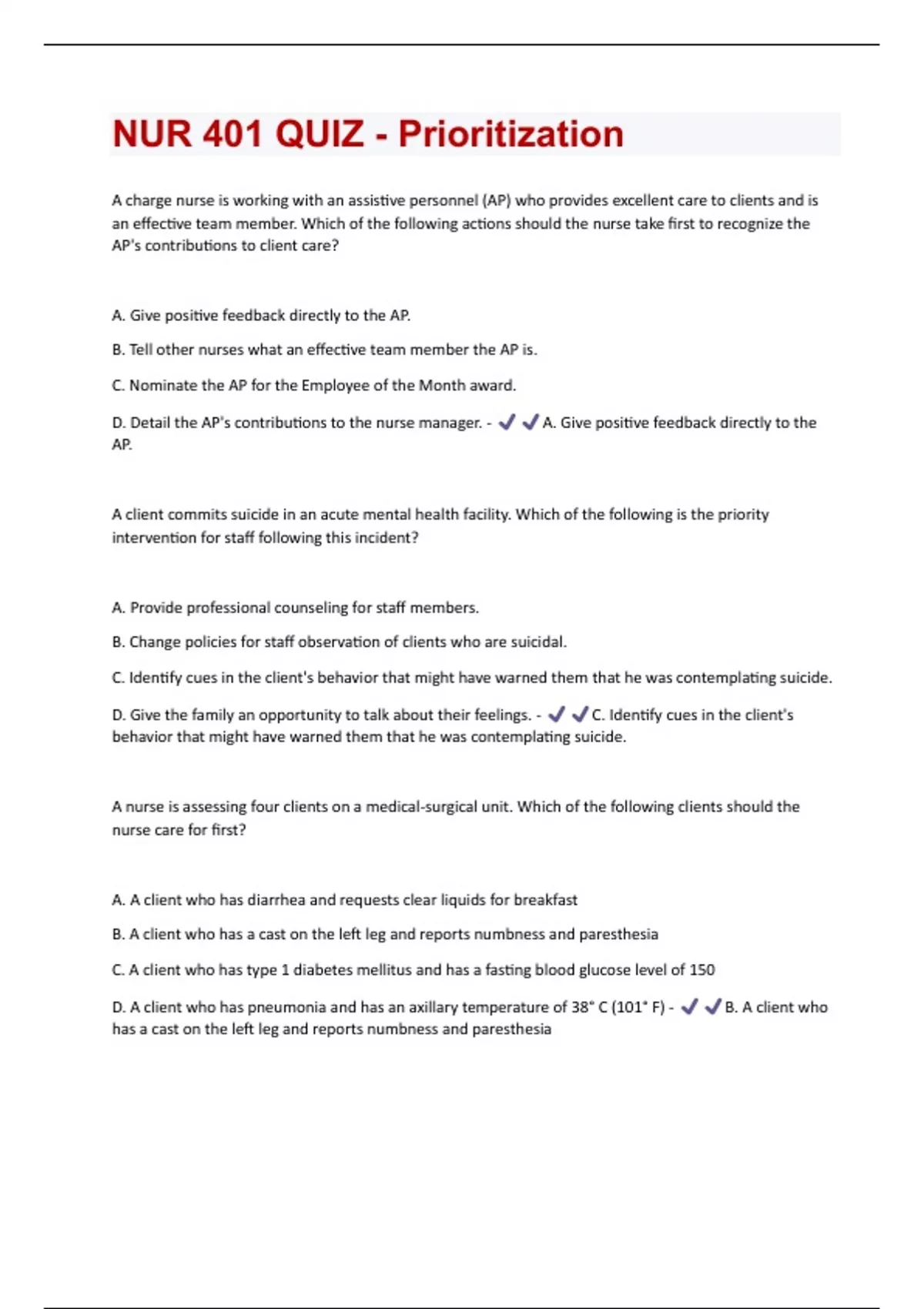NUR 401 QUIZ - Prioritization Questions And Answers (2024/ 2025) (Verified Answers)