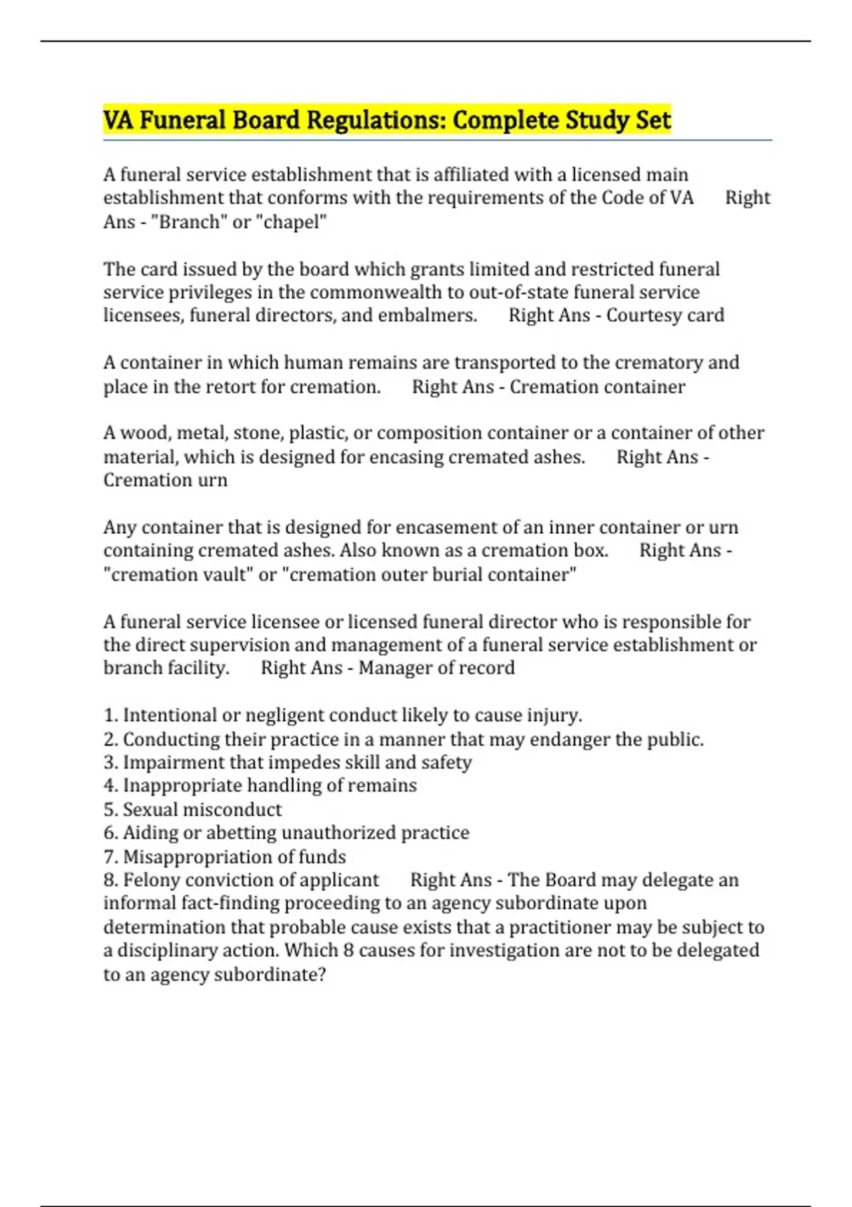 va funeral board regulations complete study set