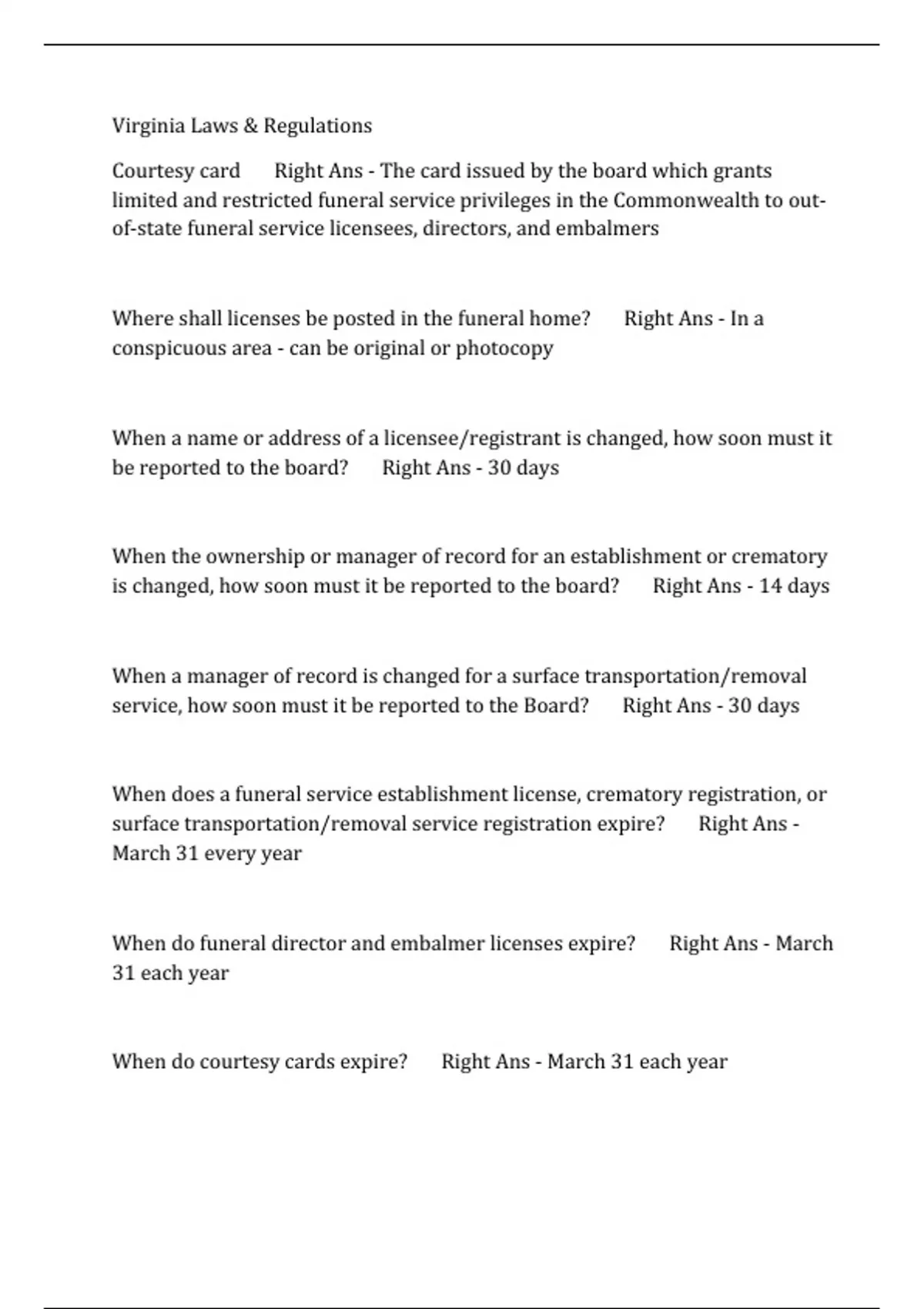 When does a funeral service establishment license, crematory registration, or surface transportation/removal service registration expire? Right Ans - March 31 every year
