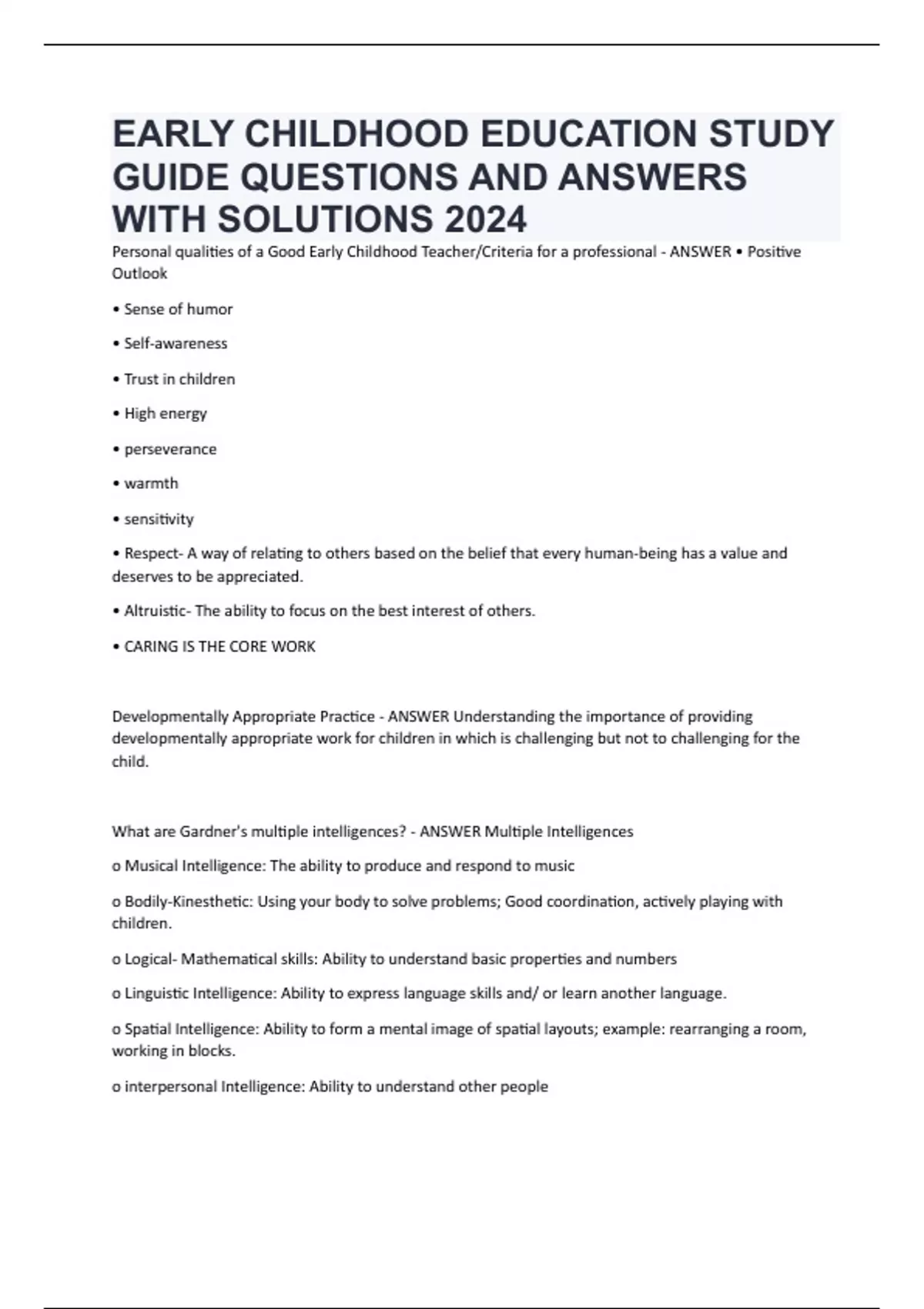 EARLY CHILDHOOD EDUCATION STUDY GUIDE QUESTIONS AND ANSWERS WITH SOLUTIONS 2024