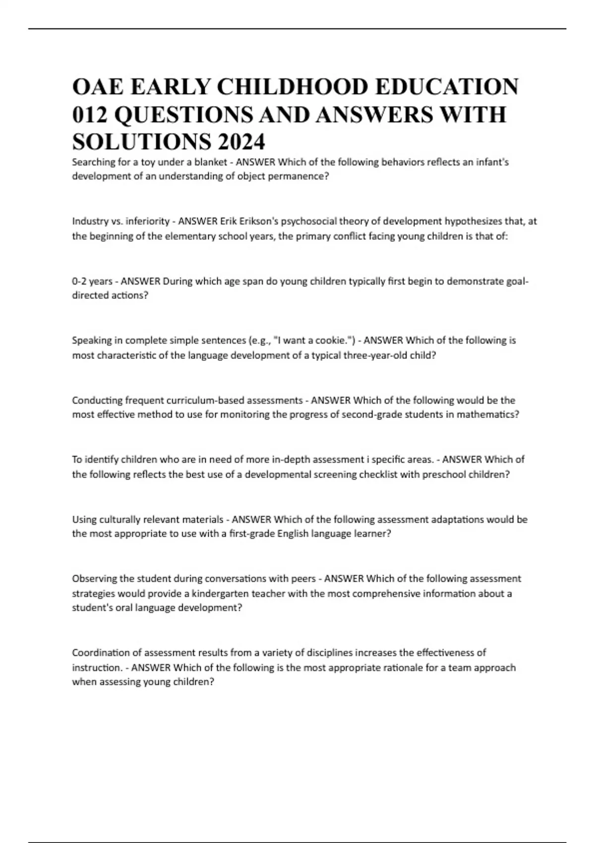 OAE EARLY CHILDHOOD EDUCATION 012 QUESTIONS AND ANSWERS WITH SOLUTIONS 2024