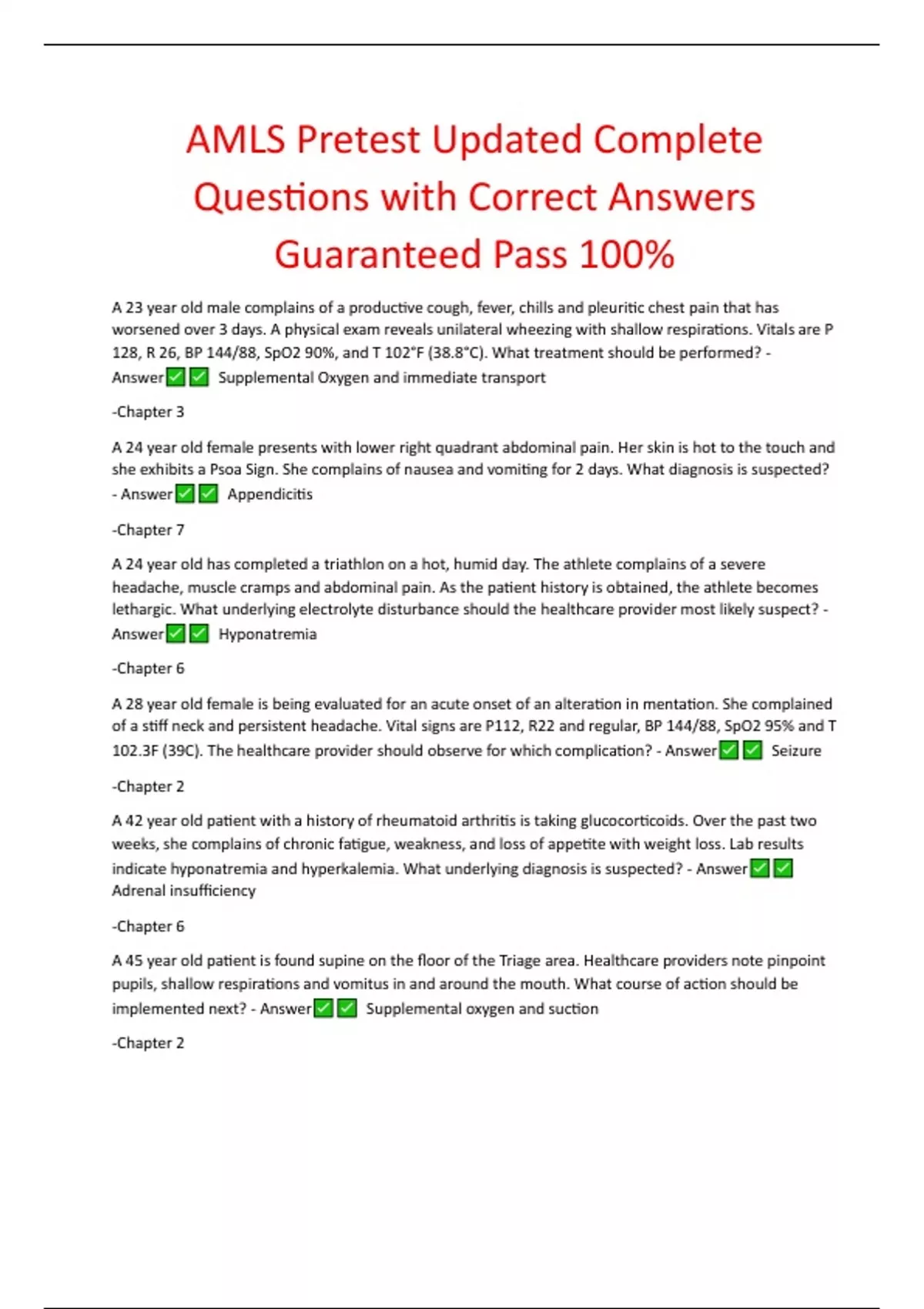 AMLS Post Test Updated Questions with Correct Solution Guaranteed Pass 100% 1. A 45-year-old patient is found supine on the floor. Healthcare providers note pinpoint pupils, shallow respirations, and vomitus in and around the mouth. What course of action should be taken next? - Answer b. Supplemental oxygen and suction 2. Patients with a history of COPD that present with an acute onset of shortness of breath are likely to have what condition? - Answer a. Pulmonary embolism 3. During compensatory shock, the renin-angiotensin-aldosterone system is activated to cause a/an: - Answer a. Increase in preload, afterload, and re-absorption of sodium 4. What clinical findings are most commonly associated with a pulmonary embolus? - Answer a. Clear breath sounds with tachypnea 5. What condition is most likely to cause respiratory acidosis? - Answer b. Narcotic overdose 6. A 55-year-old complains of an 'aching' chest discomfort that persists over several days. The patient has a temperature of 101F (38.3C). Which finding will help narrow the diagnosis to pericarditis? - Answer d. ST-segment elevation in all leads 7. Anaphylaxis is most associated with which physiological event? - Answer b. Vasodilation 8. Acute Respiratory Distress Syndrome (ARDS) is characterized by what pathological change? - Answer c. Breakdown of the alveolar-capillary membrane 9. Continuous positive airway pressure would be most beneficial in treating which patient? - Answer b. A 22yo with severe asthma who is not responding to nebulizer treatments 10. What is the initial treatment for a patient experiencing hyperosmolar hyperglycemic nonketotic coma (HHNC)? - Answer a. Crystalloid IV fluid administration 11. Your patient has had a seizure secondary to a nerve agent exposure. What medication would be best to diminish the seizure? - Answer c. Midazolam 12. Respiratory alkalosis may occur as a result of: - Answer a. Fever and anxiety
