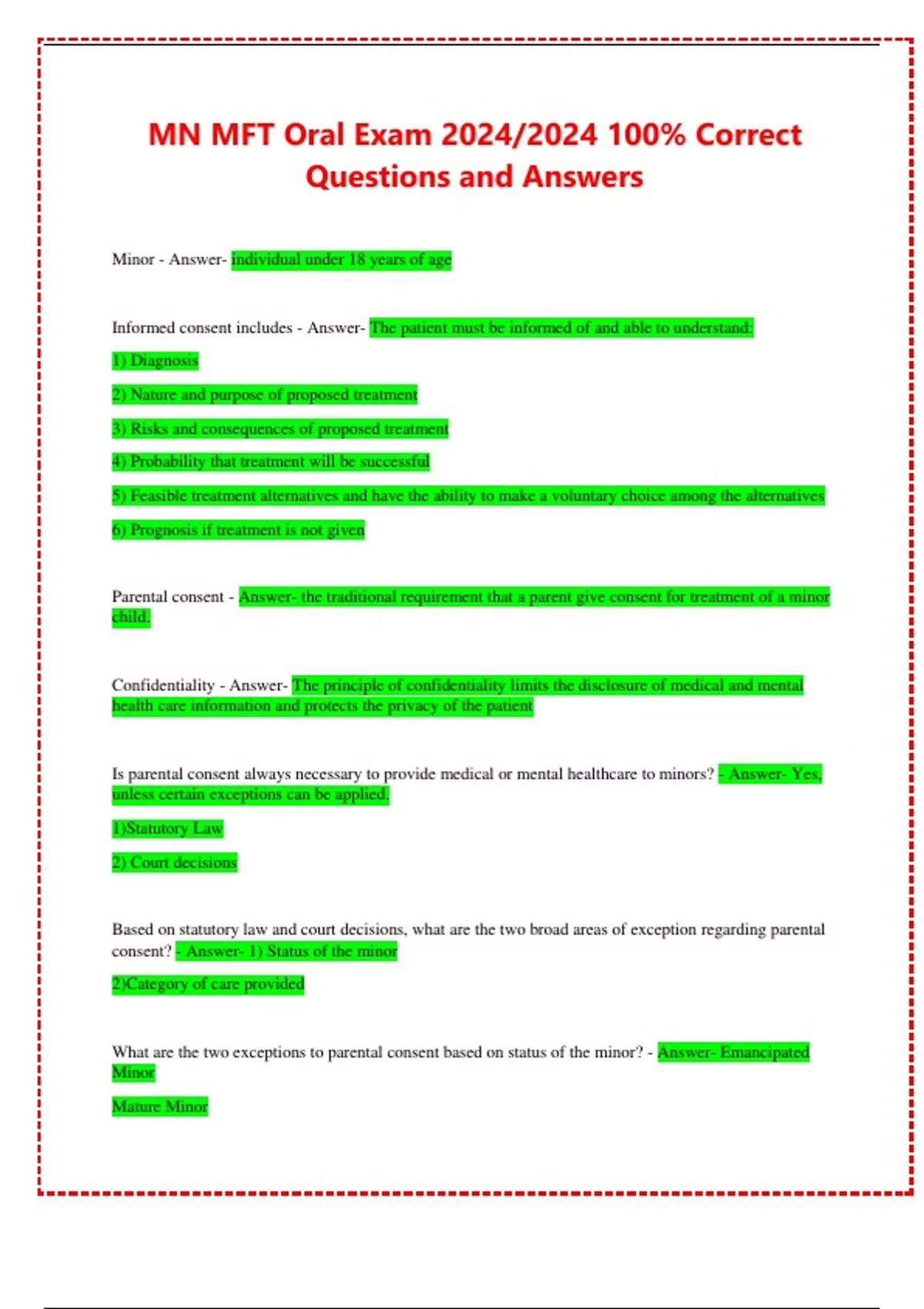 MN MFT Oral Exam 2024/2024 100% Correct Questions and Answers Minor - Answer- individual under 18 years of age Informed consent includes - Answer- The patient must be informed of and able to understand: 1) Diagnosis 2) Nature and purpose of proposed treatment 3) Risks and consequences of proposed treatment 4) Probability that treatment will be successful 5) Feasible treatment alternatives and have the ability to make a voluntary choice among the alternatives 6) Prognosis if treatment is not given Parental consent - Answer- the traditional requirement that a parent give consent for treatment of a minor child.