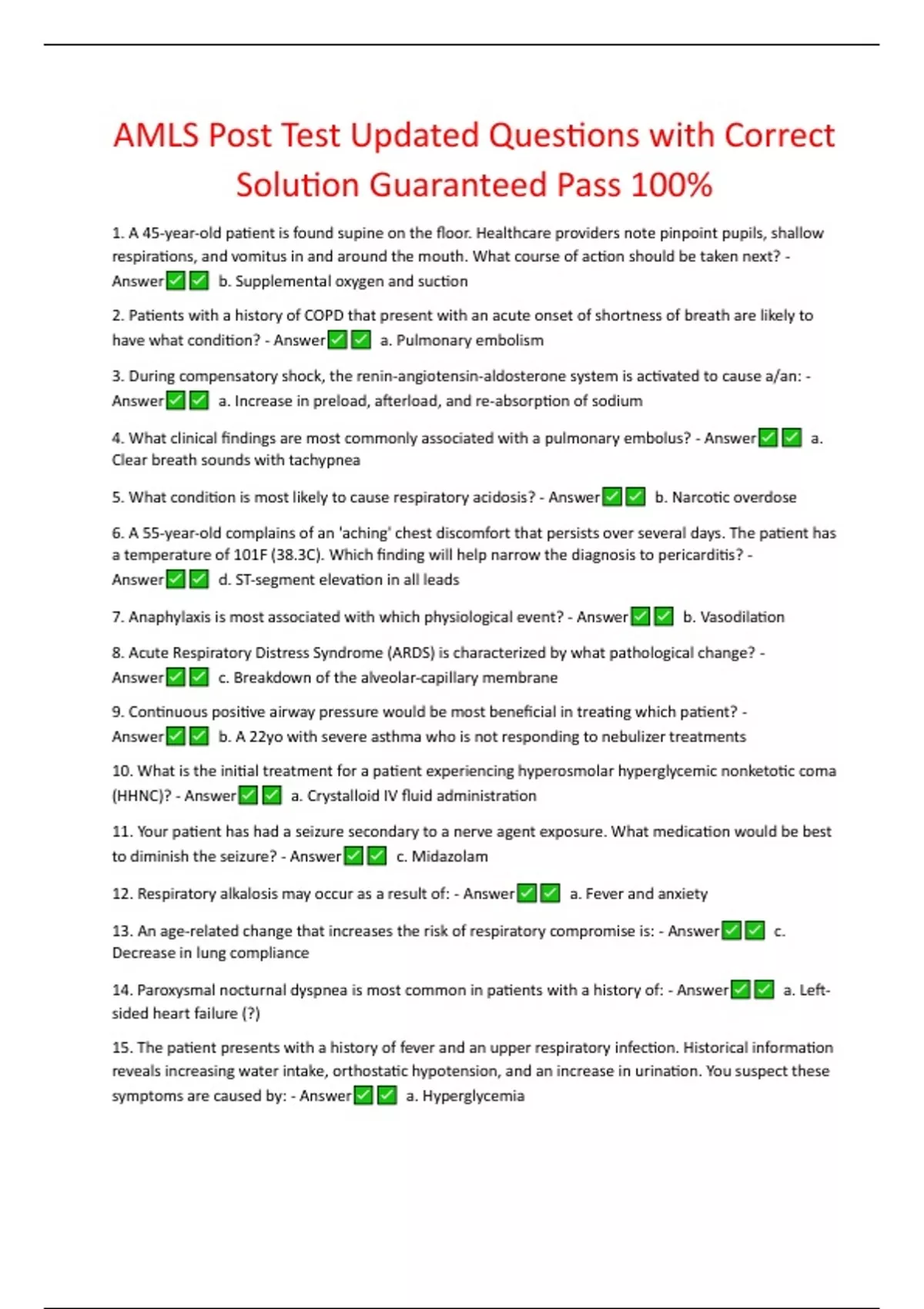 AMLS Pretest Updated Complete Questions with Correct Answers Guaranteed Pass 100% A 23 year old male complains of a productive cough, fever, chills and pleuritic chest pain that has worsened over 3 days. A physical exam reveals unilateral wheezing with shallow respirations. Vitals are P 128, R 26, BP 144/88, SpO2 90%, and T 102°F (38.8°C). What treatment should be performed? - Answer Supplemental Oxygen and immediate transport -Chapter 3 A 24 year old female presents with lower right quadrant abdominal pain. Her skin is hot to the touch and she exhibits a Psoa Sign. She complains of nausea and vomiting for 2 days. What diagnosis is suspected? - Answer Appendicitis -Chapter 7 A 24 year old has completed a triathlon on a hot, humid day. The athlete complains of a severe headache, muscle cramps and abdominal pain. As the patient history is obtained, the athlete becomes lethargic. What underlying electrolyte disturbance should the healthcare provider most likely suspect? - Answer Hyponatremia -Chapter 6 A 28 year old female is being evaluated for an acute onset of an alteration in mentation. She complained of a stiff neck and persistent headache. Vital signs are P112, R22 and regular, BP 144/88, SpO2 95% and T 102.3F (39C). The healthcare provider should observe for which complication? - Answer Seizure -Chapter 2 A 42 year old patient with a history of rheumatoid arthritis is taking glucocorticoids. Over the past two weeks, she complains of chronic fatigue, weakness, and loss of appetite with weight loss. Lab results indicate hyponatremia and hyperkalemia. What underlying diagnosis is suspected? - Answer Adrenal insufficiency -Chapter 6