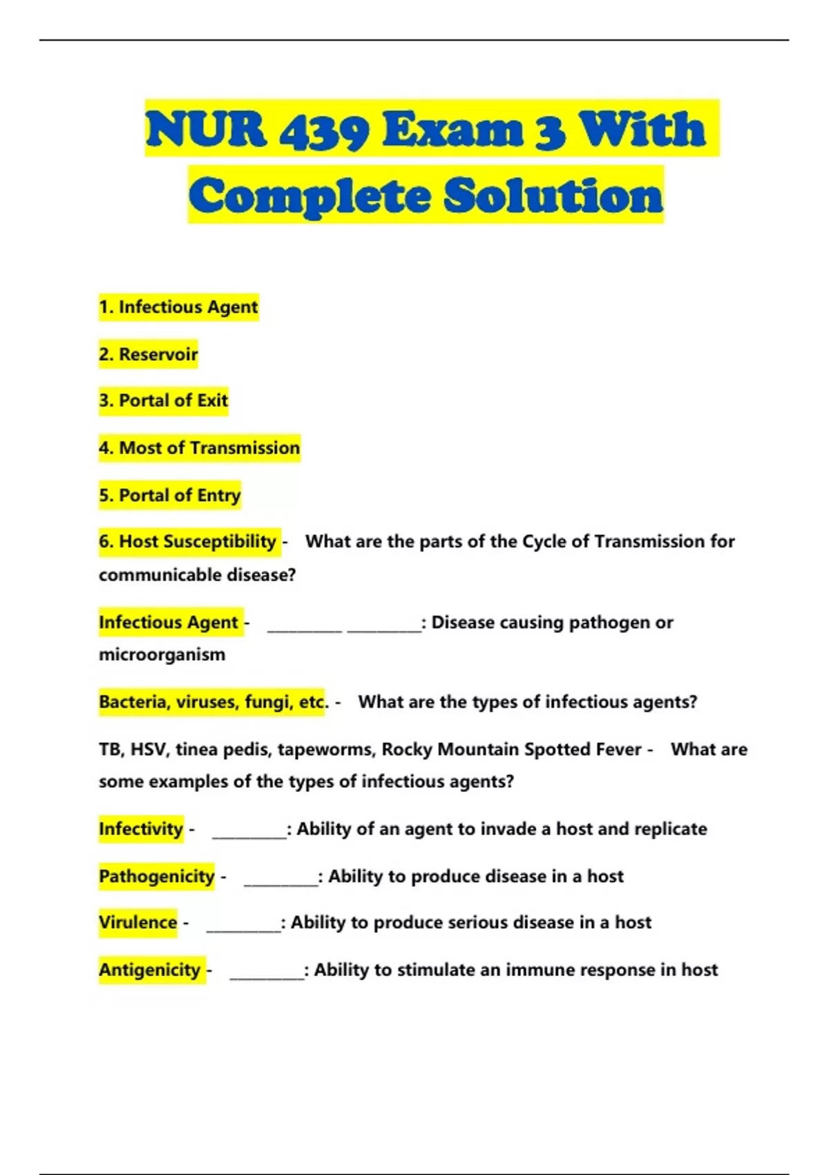 NUR 439 Exam 3 Wi th Compl ete So lution 1. Infectious Agent 2. Reservoir 3. Portal of Exit 4. Most of Transmission 5. Portal of Entry 6. Host Susceptibility - What are the parts of the Cycle of Transmission for communicable disease? Infectious Agent - __________ __________: Disease causing pathogen or microorganism Bacteria, viruses, fungi, etc . - What are the types of infectious agents? TB, HSV, tinea pedis, tapeworms, Rocky Mountain Spotted Fever - What are some examples of the types of infectious agents? Infectivity - __________: Ability of an agent to invade a host and replicate Pathogenicity - __________: Ability to produce disease in a host Virulence - __________: Ability to produce serious disease in a host Antigenicity - __________: Ability to stimulate an immune response in host Toxigenicity - __________: Ability to produce a toxin in host Reservoir - __________: Environment in where the agent resides reservoirs - People, animals, food, water, and other organic substances are all examples of: Portal of Exit - __________ _____ __________: How the agent leaves its reservoir portal of exit - Blood, body fluids, airborne droplets, and skin are all examples of a: Mode of Transmission - __________ _____ __________: How the agent gets from one host to another Direct, Indirect, Airborne - Name the three main Modes of Transmission. Direct - This type of transmission is due to an immediate person- to-person transfer. It may be through direct physical contact like sexual transmission or skin-to-skin contact. It may also be by the direct projection of droplet ray onto the conjunctiva or the mucous membrane of the eye, nose, or mouth during sneezing, coughing, spitting, singing, or talking. Vehicle-borne and vector-borne - Name the two types of indirect transmission of communicable disease. Vehicle-borne - This type of indirect transmission is caused by contaminated inanimate objects: water, food, milk; biological products including blood and body fluids; or any substance serving as an intermediate means that transports an agent to a host. The agent may or may not have manipulated or developed. Vector-borne - This type of indirect transmission is caused by biological or mechanical means. Biological occurs when something carries disease as a part of its lifecycle (i.e., Mosquitos and malaria). Mechanical occurs when something carries disease from one source to another without multiplication or growth (i.e., Fly food contamination). Fomite - __________: Contaminated inanimate object Airborne - This type of transmission is due to dissemination of microbial aerosols to portal of entry, usually respiratory tract. Microbial aerosols are suspensions of particles in the air and may remain suspended in the air for long periods of time. Droplet Nuclei - __________ __________: Usually the small residues that result from evaporation of fluid from droplets emitted by an infected host Dust - __________: The small particles that may arise from soil, clothes, bedding, or floors Portal of Entr y - __________ _____ __________: How the agent enters the new host Nonintact skin and mucous membrane - What are the two main routes for portal of entry? Host Susceptibility - __________ __________: Any person who can "catch" an illness or communicable disease FALSE (Host susceptibility is not equal and depends on biological characteristics, general health status, and immune system/immunity.) - True or False: All hosts are equally susceptible. Age - What is one biological characteristic that influences host susceptibility? Host, agent, environment - What is the Epidemiological Triad? Changes to the host, agent, and/or environment are factors that influence emerging infection - How does the Epidemiological Triad relate to communicable disease? Host - Human susceptibility to infection and human demographics and behavior are examples of change to the __________, which is part of the Epidemiological Triad. Agent - Microbial susceptibility to infection is an example of change to the __________, which is part of the Epidemiological Triad. Environment - Climate and weather, changing ecosystems, international travel and commerce, and war and famine are examples of change to the __________, which is part of the Epidemiological Triad. Emerging Infectious Disease - __________ __________ __________: Newly identified clinically distinct infectious disease, or the reappearance of a known infectious disease after its decline (i.e., SARS, Avian flu, H1N1, West Nile Virus, TB, etc.) Ebola, Covid-19, Monkeypox - What are some more recent examples of emerging infectious diseases? Resistance and immunity (natural, artificial, herd) - What are the principles of immunity? Resistance - __________: Ability to ward off infection Immunity - __________: Resistance to specific pathogens Active - Is this Active or Passive Natural Immunity?