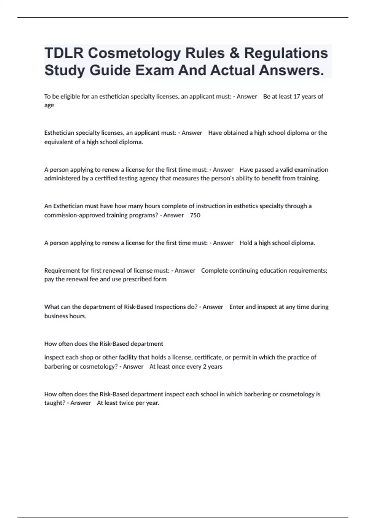 To be eligible for an esthetician specialty licenses, an applicant must: - Answer Be at least 17 years of age Esthetician specialty licenses, an applicant must: - Answer Have obtained a high school diploma or the equivalent of a high school diploma. A person applying to renew a license for the first time must: - Answer Have passed a valid examination administered by a certified testing agency that measures the person's ability to benefit from training. An Esthetician must have how many hours complete of instruction in esthetics specialty through a commission-approved training programs? - Answer 750 A person applying to renew a license for the first time must: - Answer Hold a high school diploma. Requirement for first renewal of license must: - Answer Complete continuing education requirements; pay the renewal fee and use prescribed form What can the department of Risk-Based Inspections do? - Answer Enter and inspect at any time during business hours. How often does the Risk-Based department inspect each shop or other facility that holds a license, certificate, or permit in which the practice of barbering or cosmetology? - Answer At least once every 2 years How often does the Risk-Based department inspect each school in which barbering or cosmetology is taught? - Answer At least twice per year.
