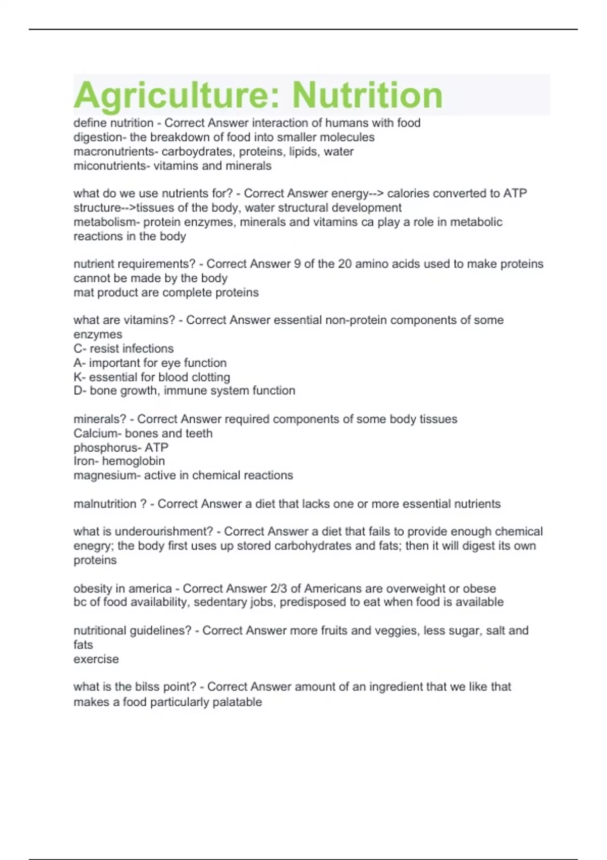 digestion- the breakdown of food into smaller molecules macronutrients- carboydrates, proteins, lipids, water miconutrients- vitamins and minerals what do we use nutrients for? - Correct Answer energy--> calories converted to ATP structure-->tissues of the body, water structural development metabolism- protein enzymes, minerals and vitamins ca play a role in metabolic reactions in the body nutrient requirements? - Correct Answer 9 of the 20 amino acids used to make proteins cannot be made by the body mat product are complete proteinswhat are vitamins? - Correct Answer essential non-protein components of some enzymes C- resist infections A- important for eye function K- essential for blood clotting D- bone growth, immune system function minerals? - Correct Answer required components of some body tissues Calcium- bones and teeth phosphorus- ATP Iron- hemoglobin magnesium- active in chemical reactions malnutrition ? - Correct Answer a diet that lacks one or more essential nutrients what is underourishment? - Correct Answer a diet that fails to provide enough chemical enegry; the body first uses up stored carbohydrates and fats; then it will digest its own proteins obesity in america - Correct Answer 2/3 of Americans are overweight or obese bc of food availability, sedentary jobs, predisposed to eat when food is available nutritional guidelines? - Correct Answer more fruits and veggies, less sugar, salt and fats exercise what is the bilss point? - Correct Answer amount of an ingredient that we like that makes a food particularly palatable