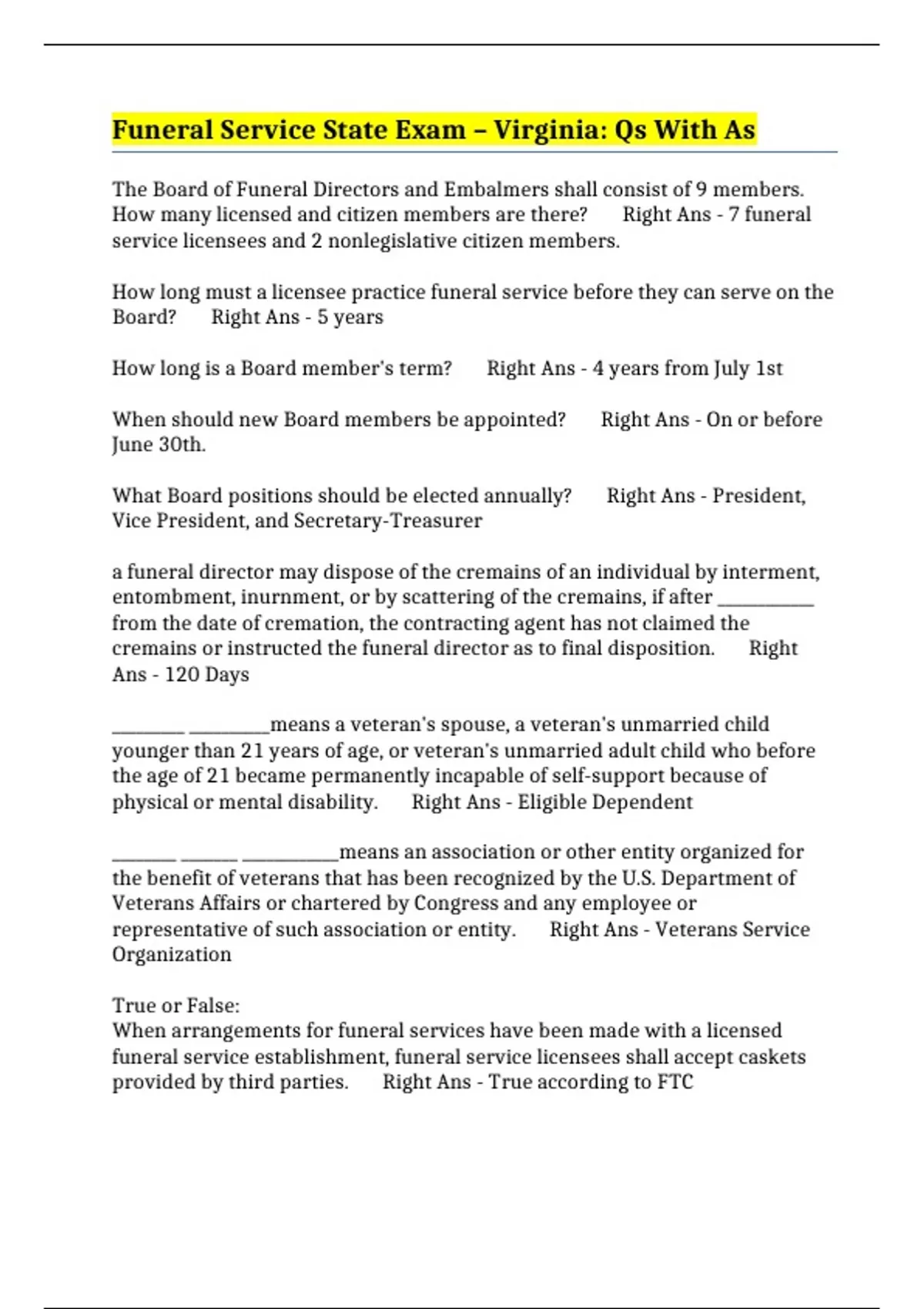 Funeral Service State Exam – Virginia: Qs With As