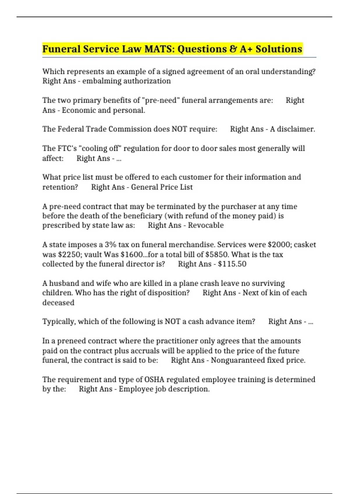 Funeral Service Law MATS: Questions & A+ Solutions