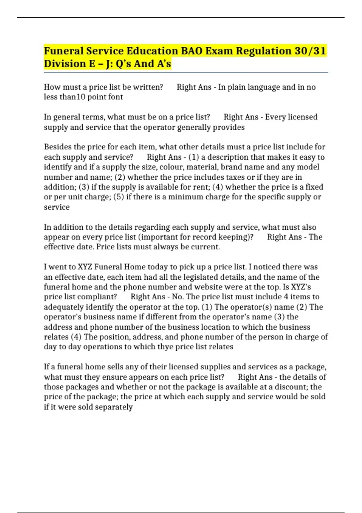 Funeral Service Education BAO Exam Regulation 30/31 Division E – J: Q’s And A’s