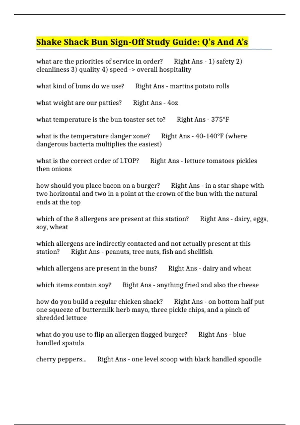 Shake Shack Bun Sign-Off Study Guide: Q’s And A’s