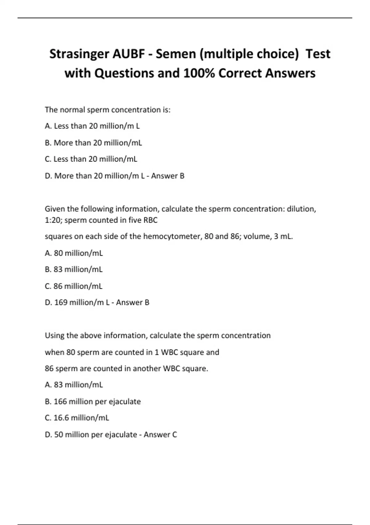 Strasinger AUBF - Semen (multiple choice) Test with Questions and 100% Correct Answers