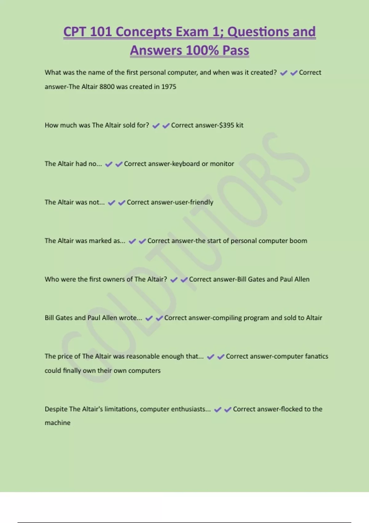 CPT 101 Concepts Exam 1; Questions and Answers 100% Pass What was the name of the first personal computer, and when was it created? Correct answer-The Altair 8800 was created in 1975 How much was The Altair sold for? Correct answer-$395 kit The Altair had no... Correct answer-keyboard or monitor The Altair was not... Correct answer-user-friendly The Altair was marked as... Correct answer-the start of personal computer boom