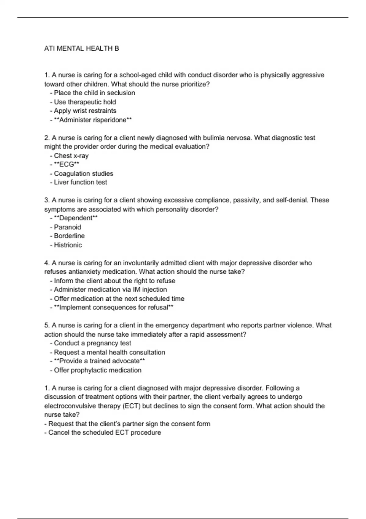 ATI MENTAL HEALTH B 1. A nurse is caring for a school-aged child with conduct disorder who is physically aggressive toward other children. What should the nurse prioritize? - Place the child in seclusion - Use therapeutic hold - Apply wrist restraints - **Administer risperidone** 2. A nurse is caring for a client newly diagnosed with bulimia nervosa. What diagnostic test might the provider order during the medical evaluation? - Chest x-ray - **ECG** - Coagulation studies - Liver function test 3. A nurse is caring for a client showing excessive compliance, passivity, and self-denial. These symptoms are associated with which personality disorder? - **Dependent** - Paranoid - Borderline - Histrionic 4. A nurse is caring for an involuntarily admitted client with major depressive disorder who refuses antianxiety medication. What action should the nurse take? - Inform the client about the right to refuse - Administer medication via IM injection - Offer medication at the next scheduled time - **Implement consequences for refusal** 5. A nurse is caring for a client in the emergency department who reports partner violence. What action should the nurse take immediately after a rapid assessment? - Conduct a pregnancy test - Request a mental health consultation - **Provide a trained advocate** - Offer prophylactic medication 1. A nurse is caring for a client diagnosed with major depressive disorder. Following a discussion of treatment options with their partner, the client verbally agrees to undergo electroconvulsive therapy (ECT) but declines to sign the consent form. What action should the nurse take? - Request that the client’s partner sign the consent form - Cancel the scheduled ECT procedure - Proceed with the preparation for ECT based on implied consent - Inform the client about the risks of refusing the ECT 2. A client expresses anger towards their partner, believing the partner thinks they are seeking attention. When the nurse tries to discuss this, the client becomes upset and asks the nurse to leave. Which defense mechanism is the client demonstrating? - Rationalization - Denial - Compensation - Displacement 3. A nurse is advising an assistive personnel (AP) on caring for a client with major depressive disorder. The AP mentions feeling irritated by the client's depression. Which statement by the nurse is appropriate? - "Please don’t take what the client said seriously when she is depressed." - "It’s important that the client feel safe verbalizing how she is feeling." - "Everybody feels that way about this client so don’t worry about it." - "I’ll change your assignment to someone who doesn’t have depressive disorder." 4. In an emergency department, a nurse assesses a child at risk for physical abuse. Which finding places the child at the greatest risk? - The child is 10 years old - The child is homeschooled - The child has no siblings - The child has cystic fibrosis 5. A nurse provides behavioral therapy to a client with obsessive-compulsive disorder who repeatedly checks locked doors at night. Which instruction should the nurse give regarding thought stopping techniques? - Keep a journal of how often you check the locks each night - Snap a rubber band on your wrist when you think about checking the locks - Ask a family member to check the lock for you at night - Focus on abdominal breathing whenever you go to check the locks 6. A nurse assesses a client experiencing alcohol withdrawal. For which finding should the nurse anticipate administration of lorazepam? - Bradycardia - Stupor - Afebrile - Hypertension 7. A nurse is creating a plan of care for a client with anorexia nervosa. Which intervention should the nurse include in the plan?