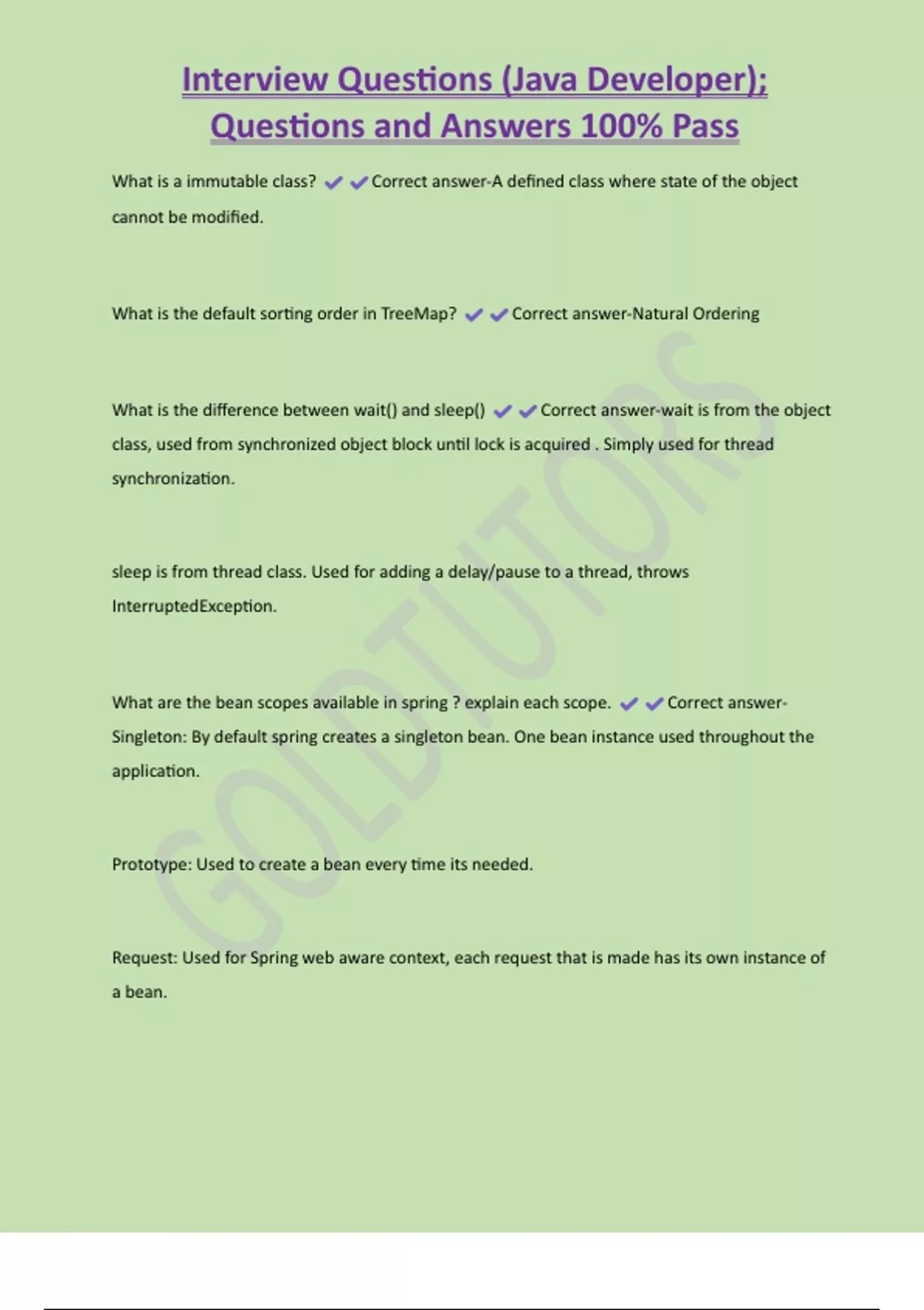 Interview Questions (Java Developer); Questions and Answers 100% Pass What is a immutable class? Correct answer-A defined class where state of the object cannot be modified. What is the default sorting order in TreeMap? Correct answer-Natural Ordering What is the difference between wait() and sleep() Correct answer-wait is from the object class, used from synchronized object block until lock is acquired . Simply used for thread synchronization