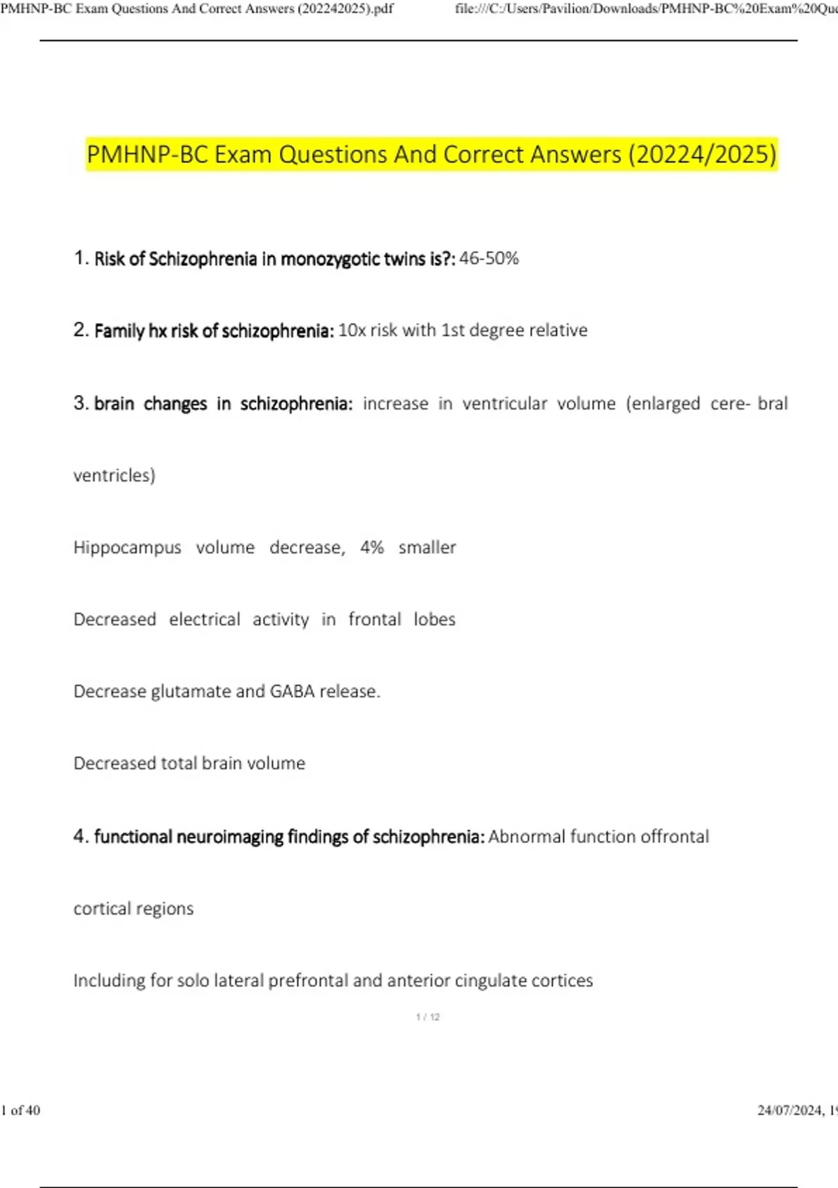 PMHNP-BC exam with correct answers Risk of Schizophrenia in monozygotic twins is? - Answer ️️ -46-50% Family hx risk of schizophrenia - Answer ️️ -10x risk with 1st degree relative brain changes in schizophrenia - Answer ️️ -increase in ventricular volume (enlarged cerebral ventricles) Hippocampus volume decrease, 4% smaller Decreased electrical activity in frontal lobes Decrease glutamate and GABA release. Decreased total brain volume functional neuroimaging findings of schizophrenia - Answer ️️ -Abnormal function of frontal cortical regions Including for solo lateral prefrontal and anterior cingulate cortices Maximum dose of Celexa - Answer ️️ -40mg/day as higher doses can cause abnormal electrical activity of the heart. Some experts still prescribe higher What class of medication is bupropion - Answer ️️ -NDRI boosts norepinephrine, noradrenaline, and dopamine neurotransmitters What hematologic change is associated with lithium? - Answer ️️ -Leukocytosis. Lithium raises WBC counts. Monitor CBC GABA in terms of anxiety disorders - Answer ️️ -Most abundant inhibitory neurotransmitter. Decreasing GABA would increase anxiety. Benzos are used to bind with GABA to potentiate the anxiolytic effects of GABA What to avoid while on Disulfiram - Answer ️️ -Anything containing alcohol (vinegar, mouthwash, aftershave, cough medicine). Avoid for 2 weeks after discontinuing disulfiram. Lab effected by disulfiram that requires monitoring - Answer ️️ -Disulfiram can elevate liver function tests A medication that can induce mania - Answer ️️ -Corticosteroids What finding would be associated with an acoustic neuroma? - Answer ️️ -Unilateral ringing in the ear (tinnitus) may be the first symptom of an acoustic neuroma. What delay is expected in a 4 year old with Asperger's? - Answer ️️ -Delay in social skills development. Unlike autistic disorder, no significant delays in language, cognitive development, or age appropriate self help skills are observed. Primary clinical features of Asperger's - Answer ️️ -Qualitative social impairment Markedly abnormal nonverbal communicative gestures Failure to develop peer relationships Lack of social or emotional reciprocity Impaired ability to express pleasure in other persons' happiness. Chlorpromazine (Thorazine) and clozapine cause what troublesome side effect due to their alpha 1-adrenergic blockade? - Answer ️️ -Orthostatic hypotension. Manage by raising dose of chlorpromazine and clozapine slowly. What medication is strictly prohibited when the patient is on an MAOI such as selegiline due to the risk of hypertensive crisis and death? - Answer ️️ -Meperidine (Demerol) Dopamine pathways in relation to clinical symptoms of schizophrenia - Answer ️️ -Negative symptoms are related to DA deficit in the cerebral cortex; positive symptoms are related to DA excess in the nucleus accumbens and mesolimbic system. Facial characteristics of child with fetal alcohol syndrome - Answer ️️ -Smal