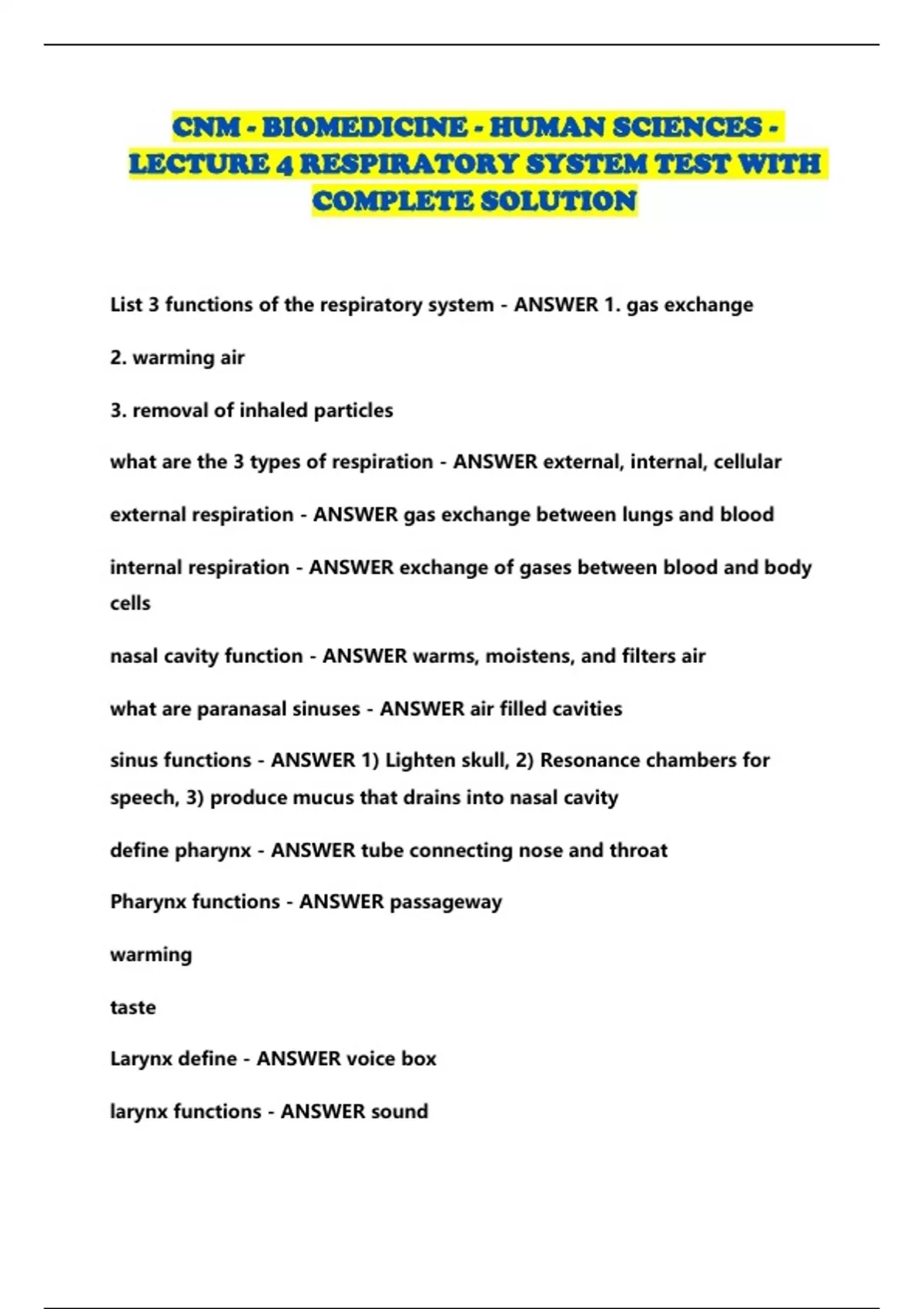 CNM - BIOMEDICINE - HUMAN SCIENCES - LECTURE 4 RESPIRATORY SYSTEM TEST WITH COMPLETE SOLUTION