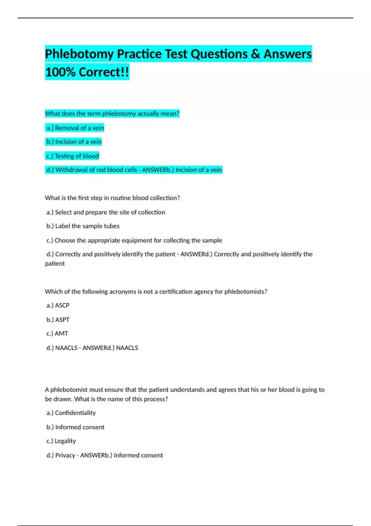 be drawn. What is the name of this process? a.) Confidentiality b.) Informed consent c.) Legality d.) Privacy - ANSWERb.) Informed consent The Health Insurance Portability and Accountability Act of 1996 regulates which of the following areas? a.) Privacy of health information b.) Health insurance transfers on changing jobs c.) Informing patients of intended procedures d.) Phlebotomy training - ANSWERa.) Privacy of health information